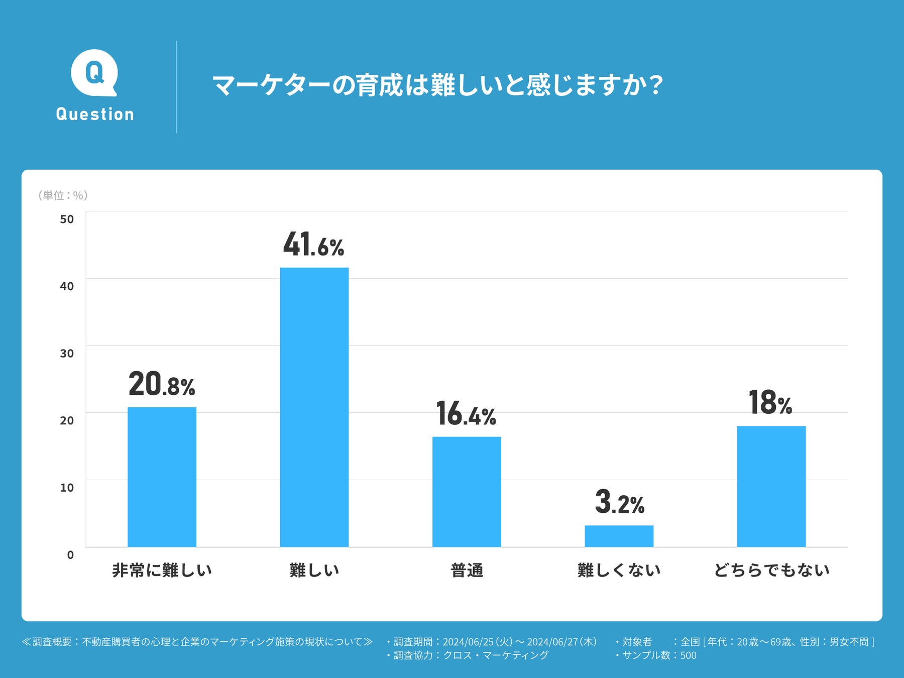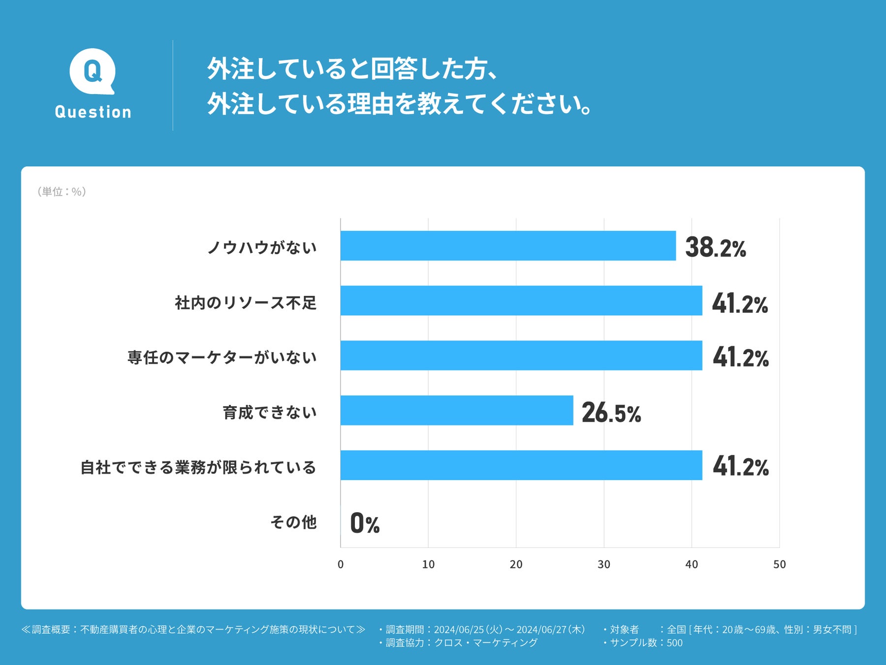外注している理由としては、主に社内のリソース不足、マーケターの不足、および育成者の不足などが挙げられます。他社との差別化が求められ、ターゲットとなる人口が減少する今、不動産業界においてマーケターは必要不可欠な存在といえますが、マーケター自体が非常に稀有で貴重な存在となっています。そのため、即戦力の採用や未経験者の育成は厳しい現状にあることがわかります。