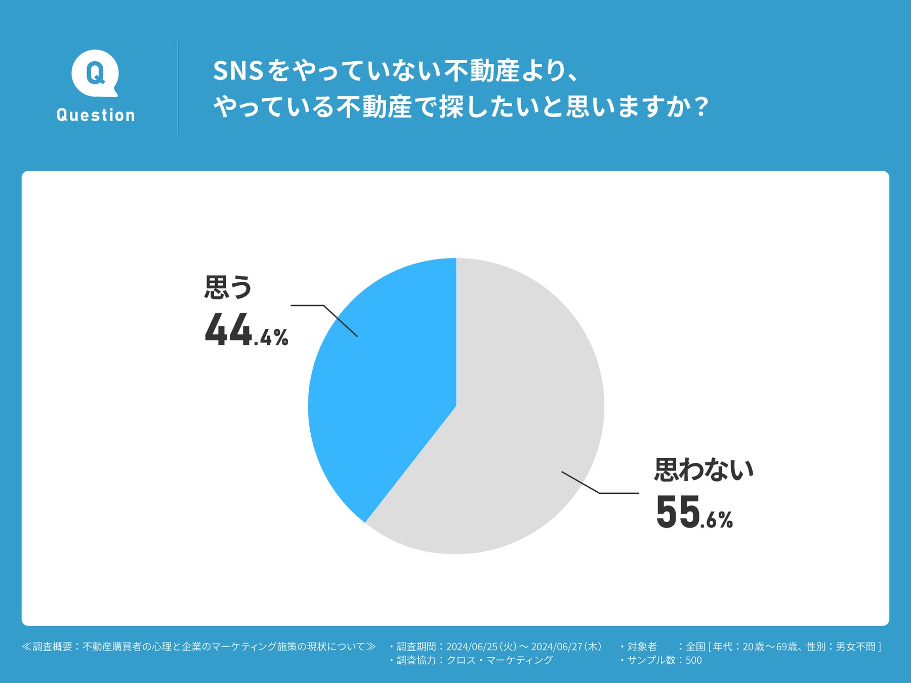 次いで、「SNSをやっていない不動産より、やっている不動産で探したいと思いますか」という問いに、4割が「思う」と回答。この結果から、SNSを効果的に活用することが、認知経路の拡大やブランド信頼性の向上に寄与することが示唆されます。従来のポータルサイトやウェブサイトに加えて、SNSを戦略的に運用することで、さらなる集客効果を得ることが可能となります。