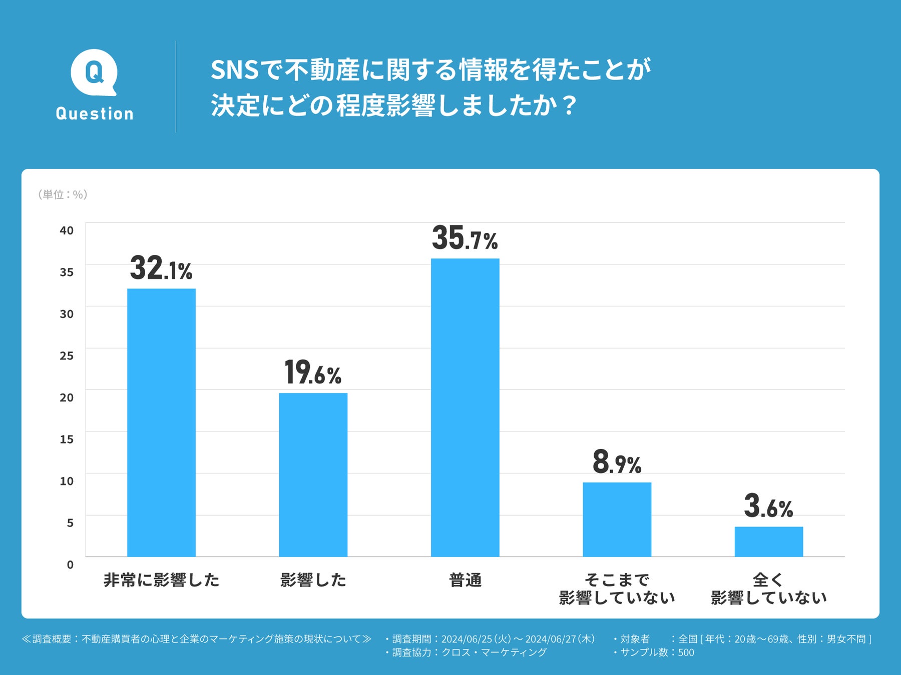 また、「SNSで不動産の写真や動画を見る事で、購入意欲が高まりましたか?」という問いに対して「非常に影響した」「影響した」と、合わせて約5割以上が回答しました。「全く影響しない」と回答した人は1割にも満たないことが分かります。