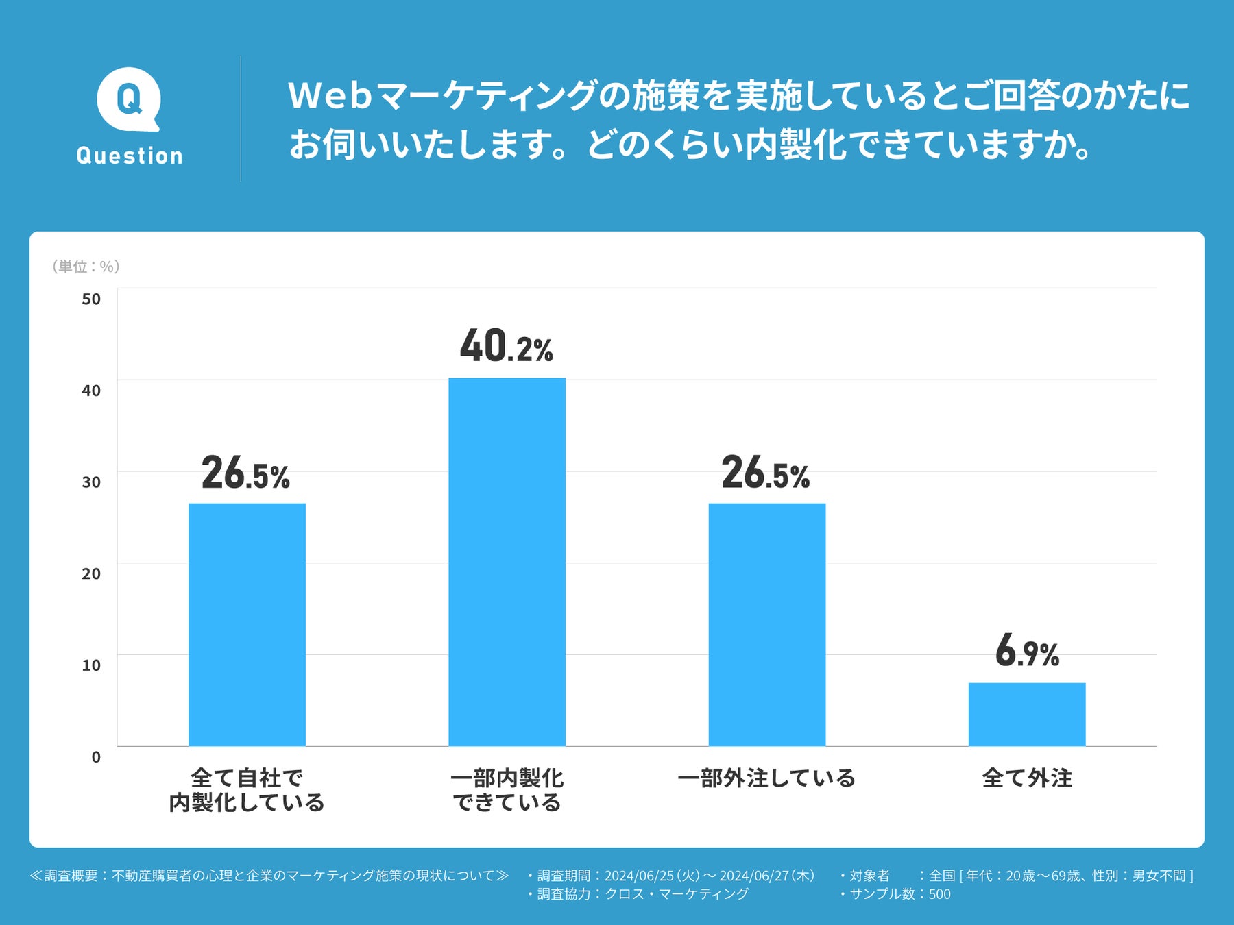 他社との差別化や独自性を伝える広告を制作するためには、自社内でマーケティング戦略を実施することが最善と言えます。しかし、調査によると、一部内製化できている企業が40%、一部外注している企業が26.5%、全て外注している企業が約7%で、全体の約8割の企業が外注に依存していることが明らかになりました。