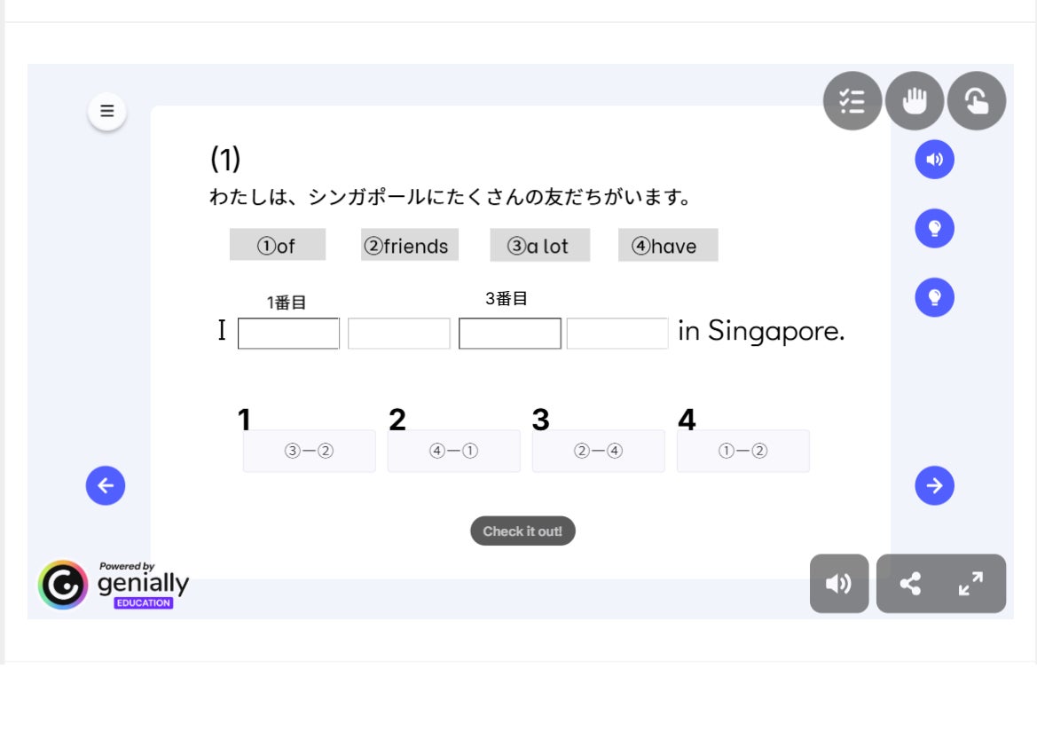 この講座の並べ替え問題では、単語をドラッグしてここだと思う場所に移動させるなどわかるところから順を追って考えることができます。書くことに苦手のあるお子さんには特におススメです。