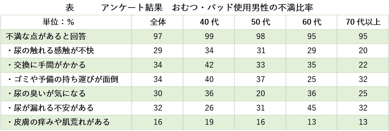 アンケート調査報告:おむつ・パッド使用の男性は97%が不満