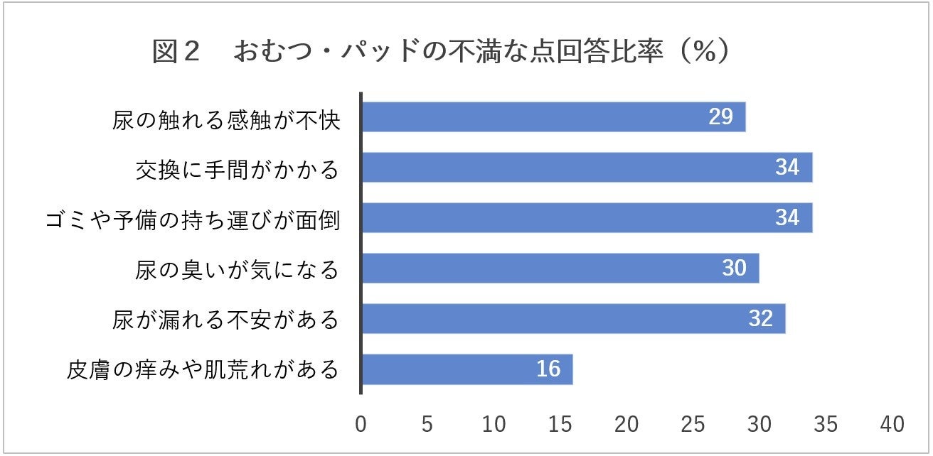 不満な点は、「ゴミや予備の持ち運びが面倒」と「交換に手間がかかる」が回答者の34%と一番多く、次いで「尿が漏れる不安がある」が32%、「尿の臭いが気になる」が30%、「尿の触れる感触が不快」が29%、「皮膚の痒みや肌荒れがある」は16%でした。