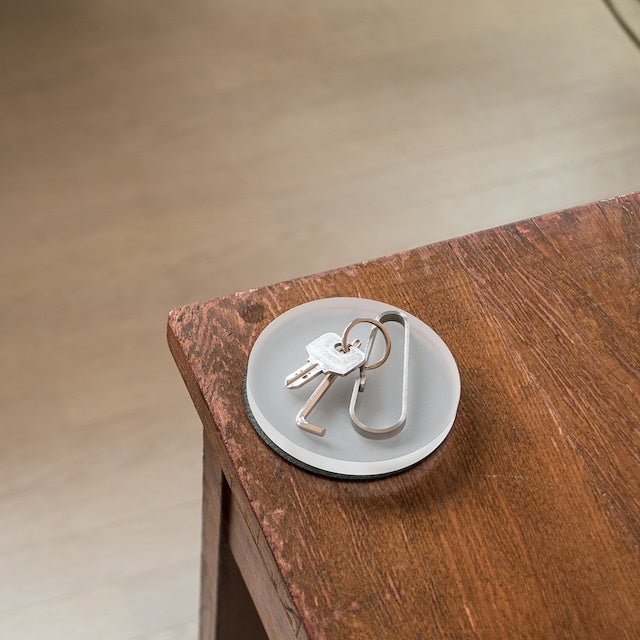 最初に見た時はレザーがアクリルの透明感を損なうのではと邪推したのだが、実際に使ってみると、アクリルトレイと机など「トレイを置く場所」との間にこのレザーが挟まることで、トレイがより空間に馴染む落ち着きを手に入れる。アクリルトレイというステージを魅力的にする舞台装置のような独特の効果がそこにあることが実感できるだろう。