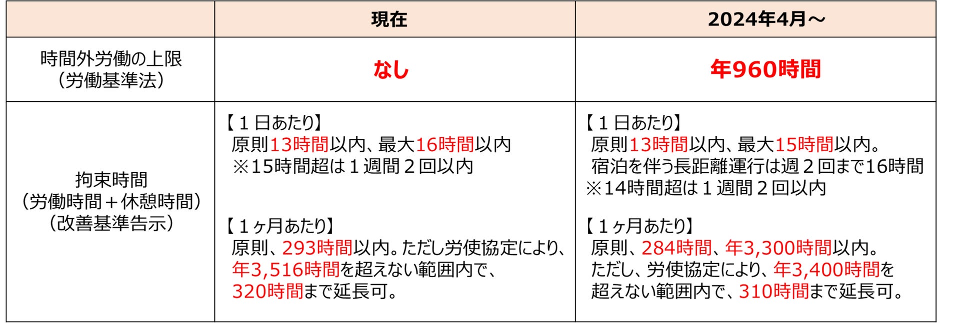また、改善基準告示によりドライバーの拘束時間がより厳しくなります。