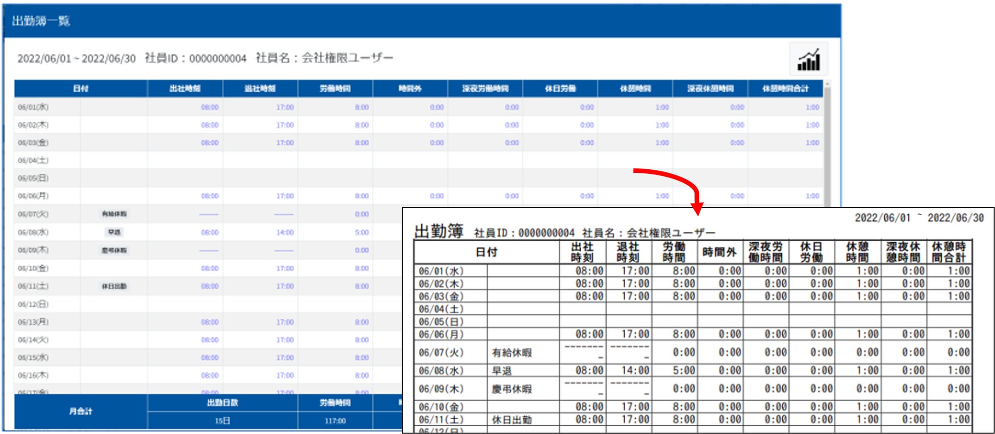 ⇒出退勤管理や労働時間(時間外含む)の一元管理が可能。また時間外労働時間において