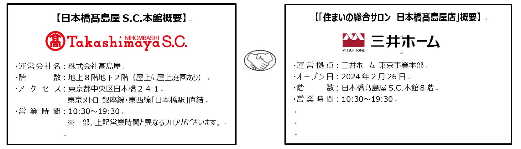 三井ホーム株式会社(本社:東京都新宿区、社長:池田 明)は、2月26日(月)に株式会社髙島屋(本社:大阪府大阪市)が運営する百貨店「日本橋髙島屋S.C.本館」内に、住まいに関する相談サロン 「住まいの総合サロン 日本橋髙島屋店」をオープンしたことをお知らせいたします。