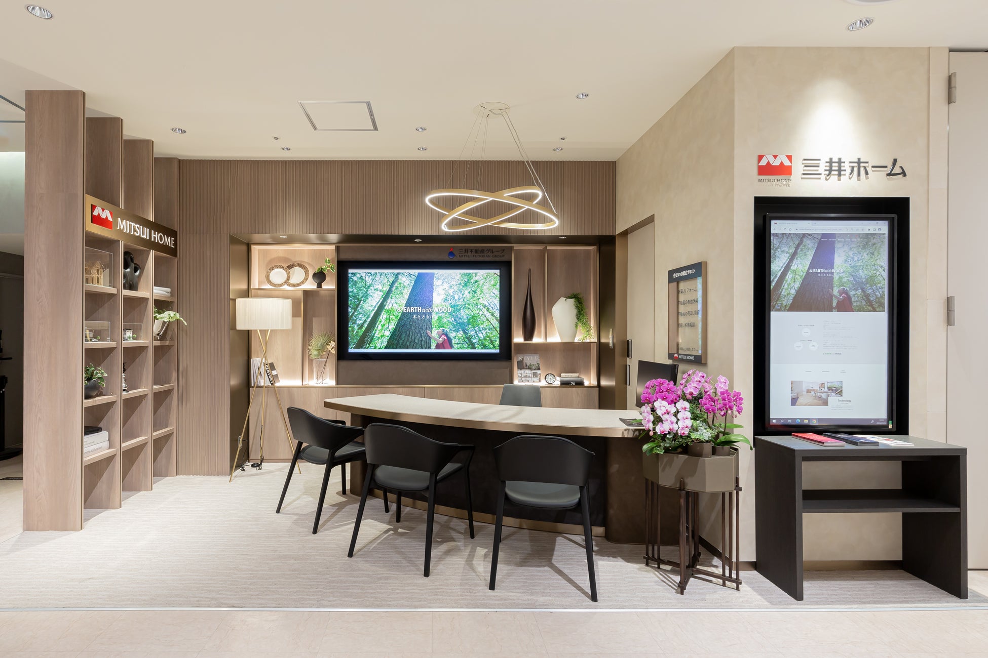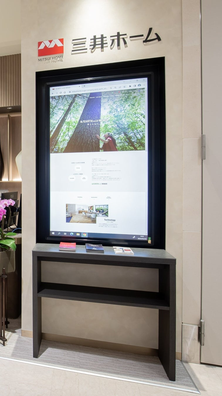 本施設の面積は4.3坪ですが、「日本橋髙島屋S.C.」という首都圏の上質なお客様が多い施設において、その施設内での長時間の商談よりも、お客様のご事情に合わせて三井ホーム並びに三井不動産グループの中からベストな提案を行う窓口へ引き継ぎする「一次受付窓口」の役割を担っています。首都圏の顧客が抱える相続税対策や資産活用の問題に対して、三井不動産グループの総力でベストな提案を行い、不動産の有効活用においては木造マンションなど、脱炭素などの時代のニーズに沿った活用提案も行います。店頭に設置したタッチパネル式のデジタルサイネージ(50インチ)では、三井ホームの新築・土地・リフォームの情報はもとより、三井不動産グループの新築・中古マンション情報や海外・リゾート・投資物件など、都心の富裕層向けの情報を幅広く紹介することもできる施設です。
