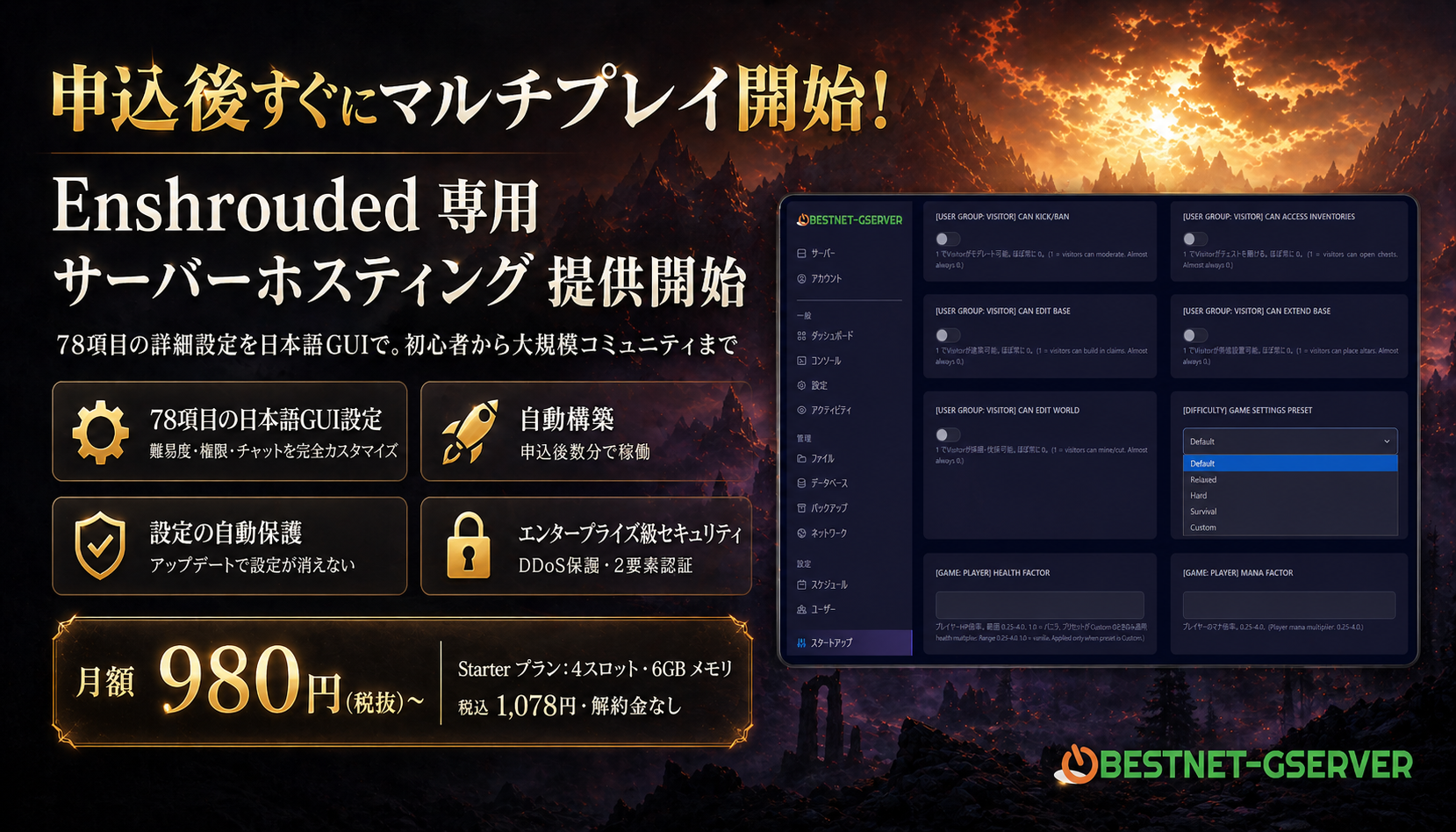 ベストネット合同会社(本社:宮城県大崎市、以下「当社」)は、「Enshrouded(エンシュラウデッド)」向け専用サーバーホスティングサービスの提供を開始いたしました。