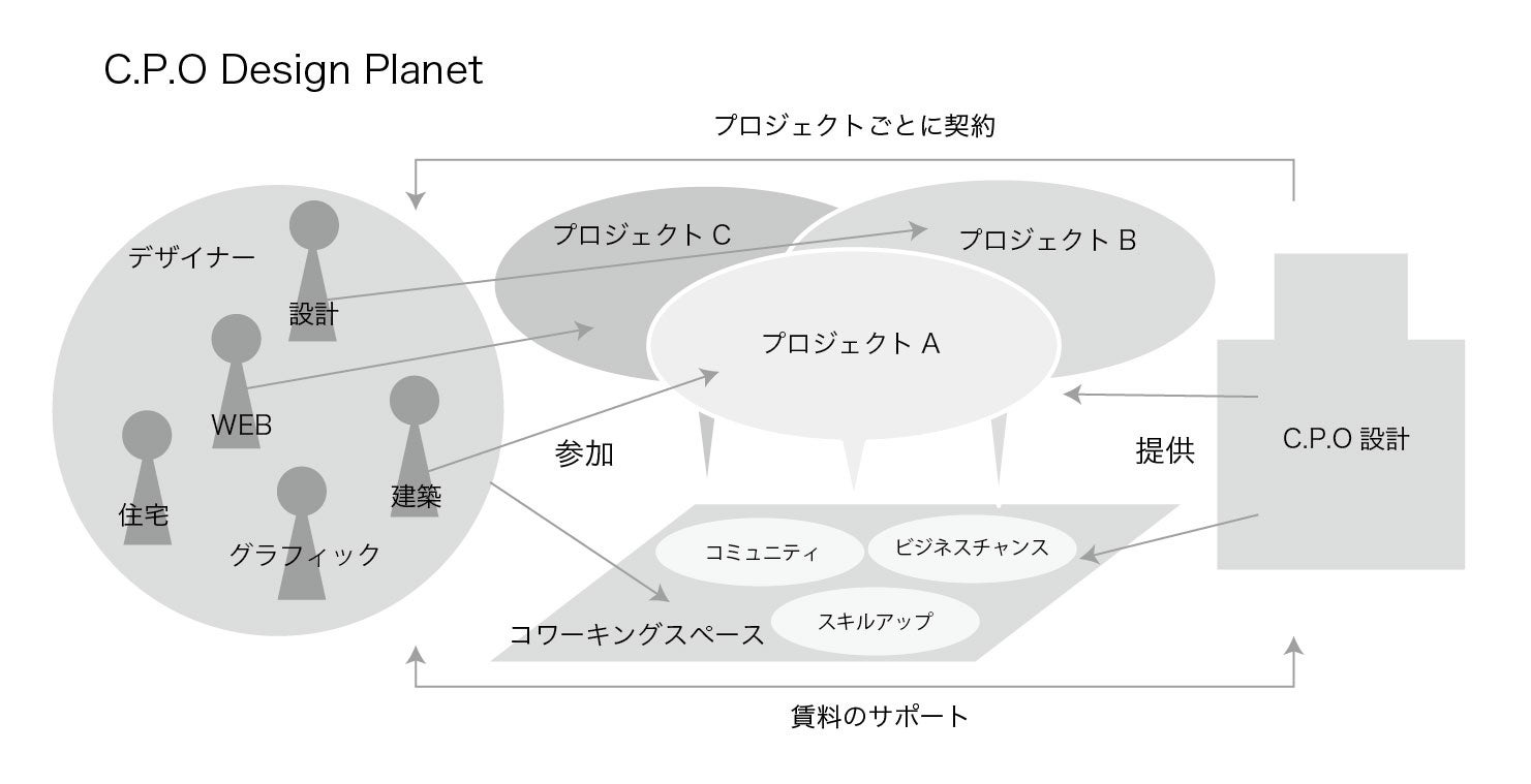全国展開で店舗を中心とした商空間の設計・施工を行うC.P.O設計は、次世代のフリーランスデザイナーにコワーキングスペースとしてコミュニケーションの場を提供しデザイナー集団を形成します。