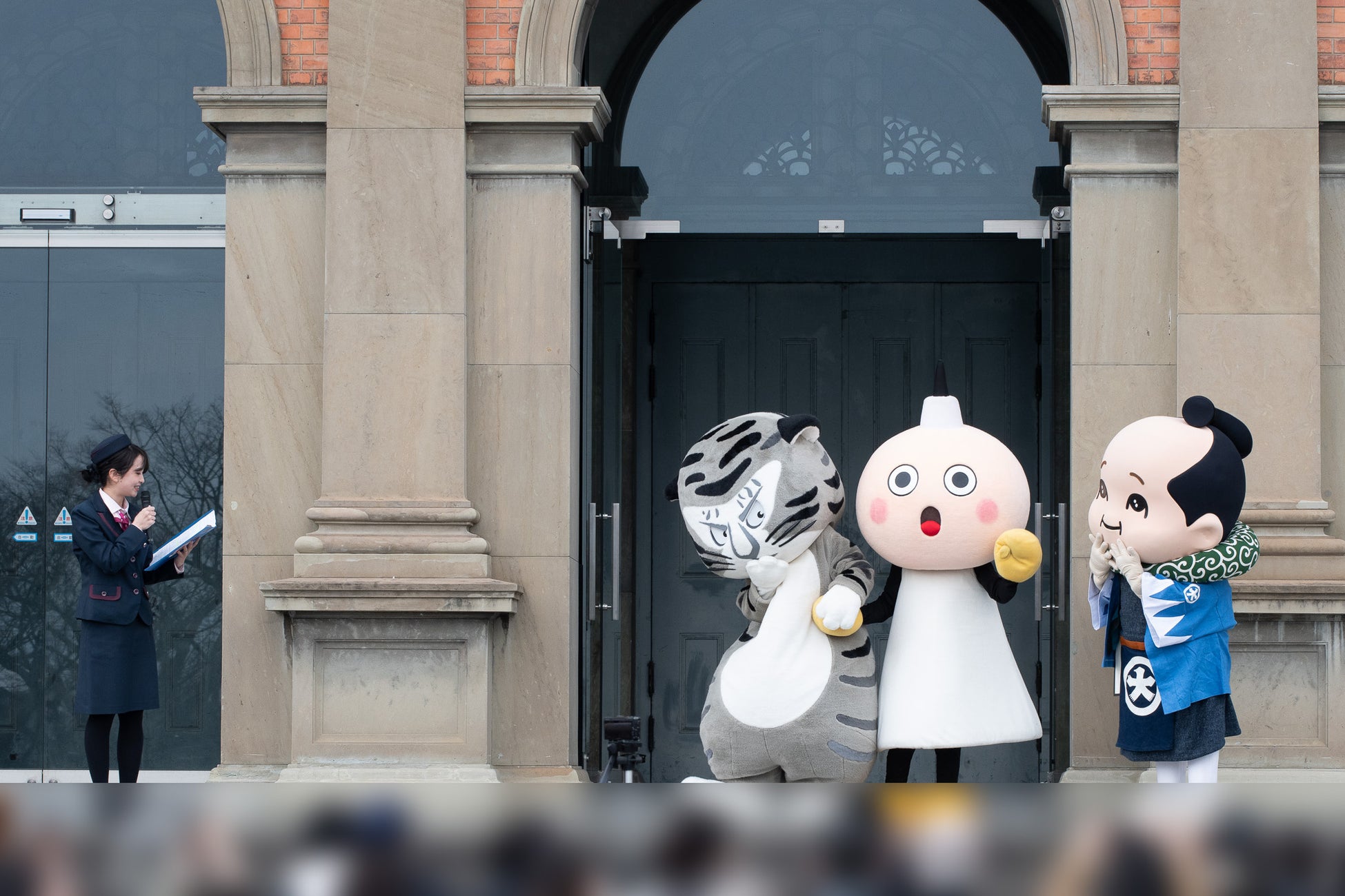 当日第1回目は明治古都館前において、第2回目は平成知新館グランドロビーで実施しました。当日の天候は雨模様が心配されましたが、それぞれ多くのお客様にお越しいただきました。合計2回のイベントでは、キャラクターが所属する企業・施設にまつわる京都検定の過去問題やオリジナル問題をキャラクターと会場のお客様が共に解答しながら、京都検定、各企業・施設について理解を深めるイベントとなりました。