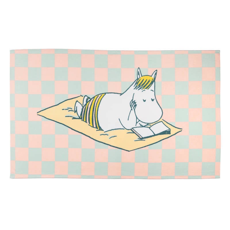 チェック柄のビーチタオルは、現在販売しているバスタオルより、ひとまわり大きいサイズです。浜辺に敷いて寝転んだり、泳いだ後に使ったり…ビーチタオルには、夏のある日、本を読みふけるスノークのおじょうさんの様子が描かれています。
