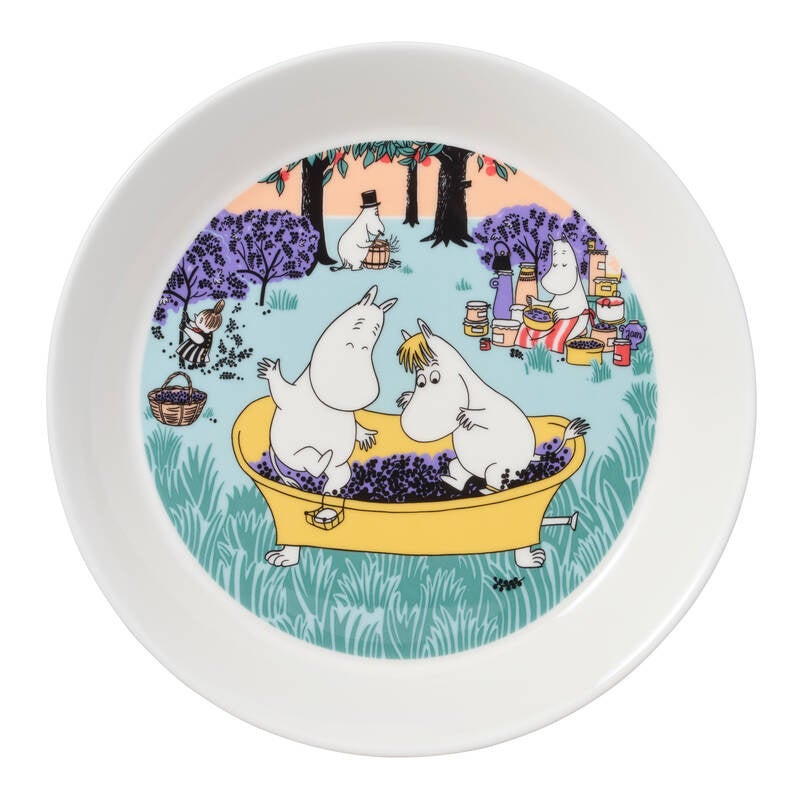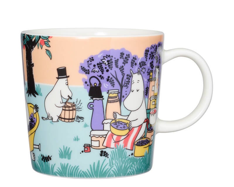 テーブルウェアのイラストでは、ムーミン一家がサイダーを作ったり、お庭で採れた赤スグリや黒スグリといったベリーでジャムを作ったりと、様々な様子がみられます。ムーミンハウスにはすでにたくさんのジャムが保管されているにもかかわらず、ムーミンママは新鮮なベリーをどうにかせずにはいられないのです!ムーミンたちはジャムを添えたパンケーキが大好き!ムーミンとスノークのおじょうさんは、桶の中でベリーをつぶすことに夢中になっています。