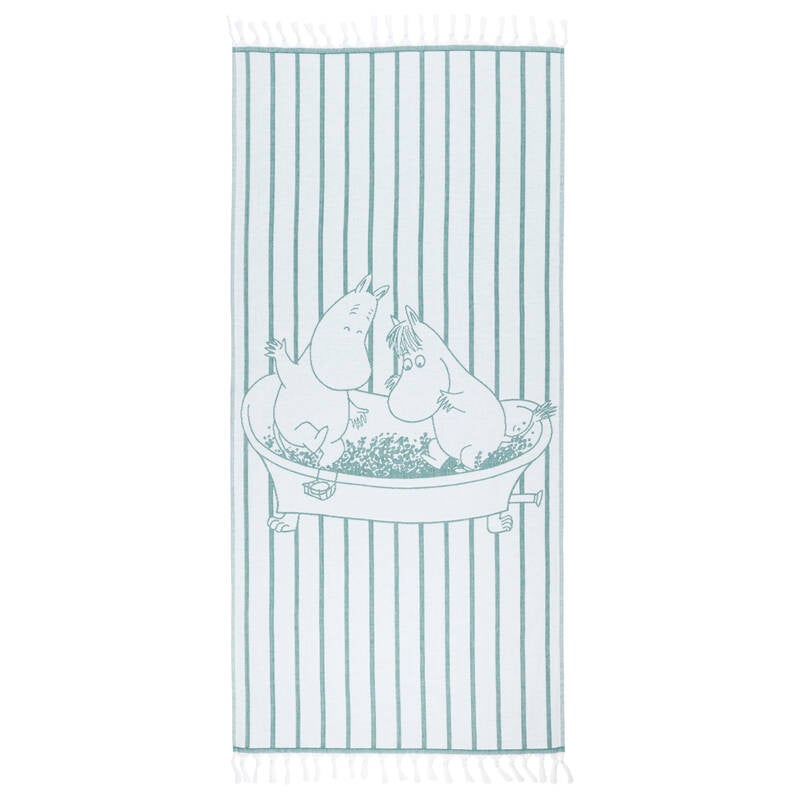 ハマムタオルは、吸水性に優れ、薄く軽量で乾きも早いのが特長で、ピクニックシートやブランケットとしても活躍します。タオルは伝統的なハマム素材にフリンジがあしらわれ、ムーミンとスノークのおじょうさんがベリーをつぶす、「ベリーシーズン」のマグやプレートと同じイラストが描かれています。
