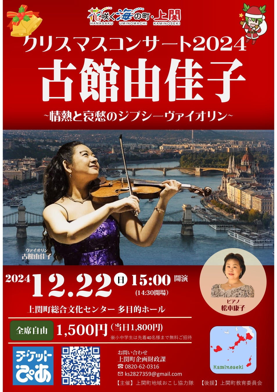 クリスマスシーズンの上関を明るく彩るクラシックコンサートを本年も実施いたします。今回は、中央ヨーロッパから来た情熱と哀愁のジプシーヴァイオリンを、本場でも高い評価を得ている古館由佳子が演奏します。懐かしの映画音楽やジブリの音楽も交えた楽しくて贅沢な時間をお過ごしください。