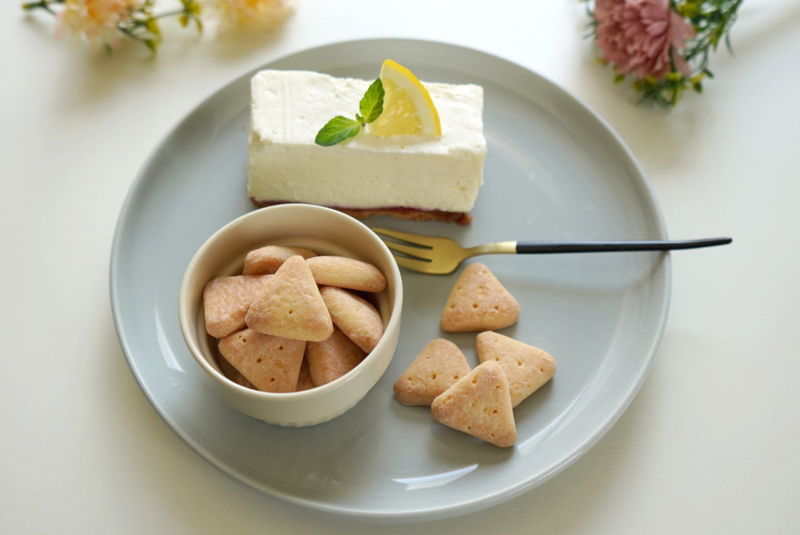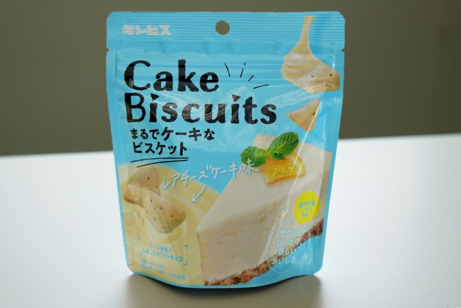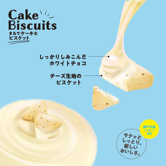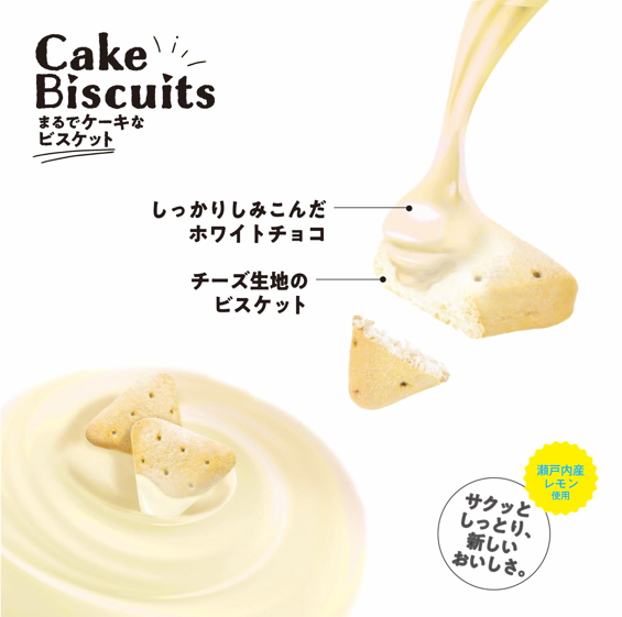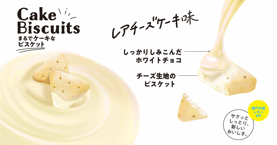 「まるでケーキなビスケット レアチーズケーキ味50g」は、ほろほろとしたくちどけの良いビスケット生地に、ホワイトチョコをしみ込ませ、レアチーズケーキをイメージするパウダーをまとわせました。瀬戸内産レモン果汁を生地に使用し、夏でもさっぱりとした爽やかな味わいに仕上げました。まるでケーキのようなしっとり食感、濃厚な味わい、くちどけが楽しめるビスケットです。