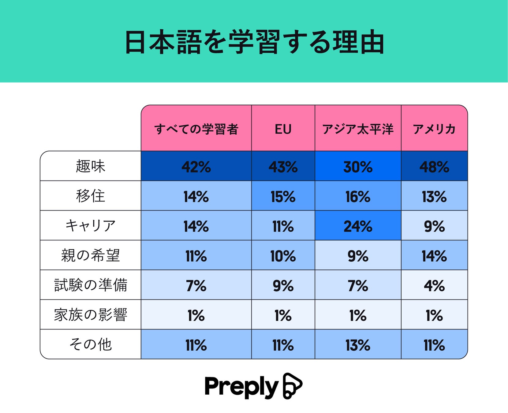 また外国人が日本語を勉強する理由は「趣味」が42%と圧倒的に多く、2位以降は「移住」や「仕事」、「両親」(親が日本語を話すため子供が日本語を学んでいる)、「試験対策」などが続きました。