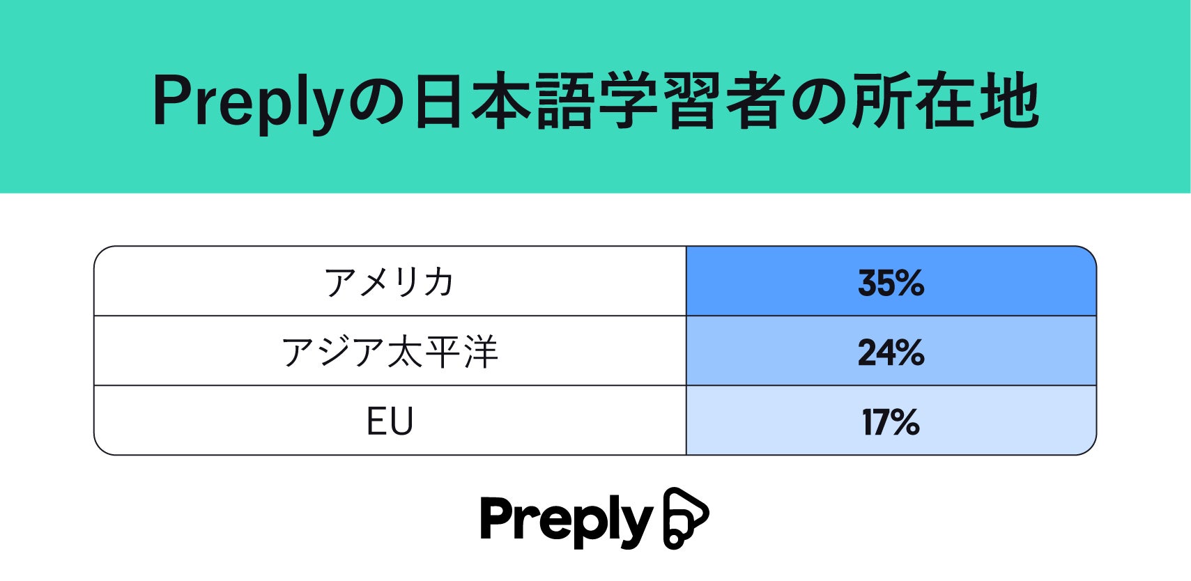 Preply(プレプリー)を使って日本語を勉強している学習者について調査したところ、日本語学習者の35%はアメリカ、24%はアジア太平洋地域、17%はEUにいることがわかりました。また、オランダやフランス、ポーランドなどのEU諸国、シンガポール、韓国、タイなどのアジア諸国では、日本語を学ぶ人が増えている傾向にあります。