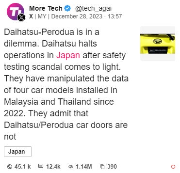 「ダイハツ・プロドゥアはジレンマに直面しています。ダイハツは安全テストのスキャンダルが明るみに出た後、日本での業務を停止しました。2022年以降、マレーシアとタイで導入されている4つの車種データを操作していました。」