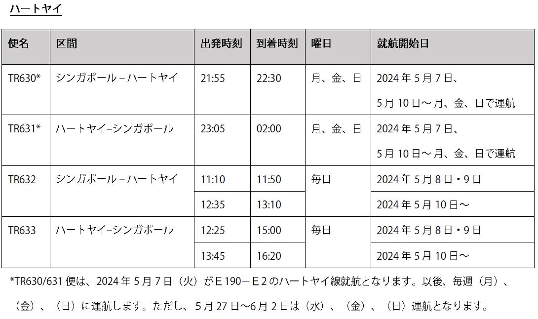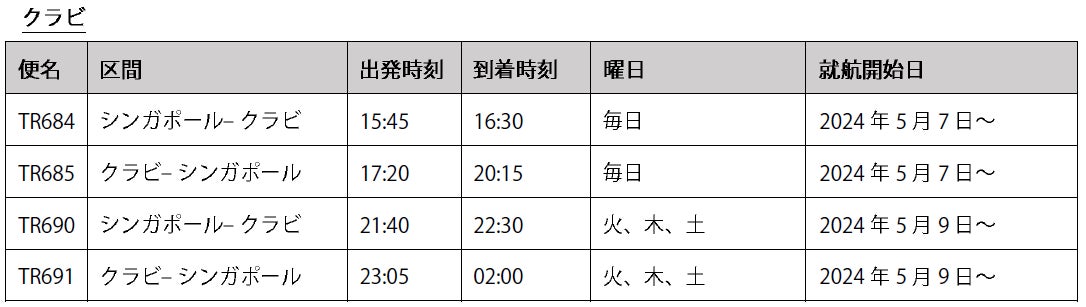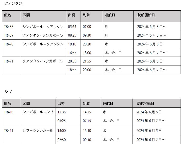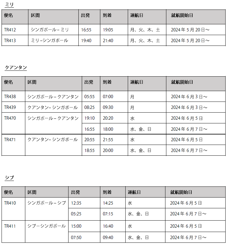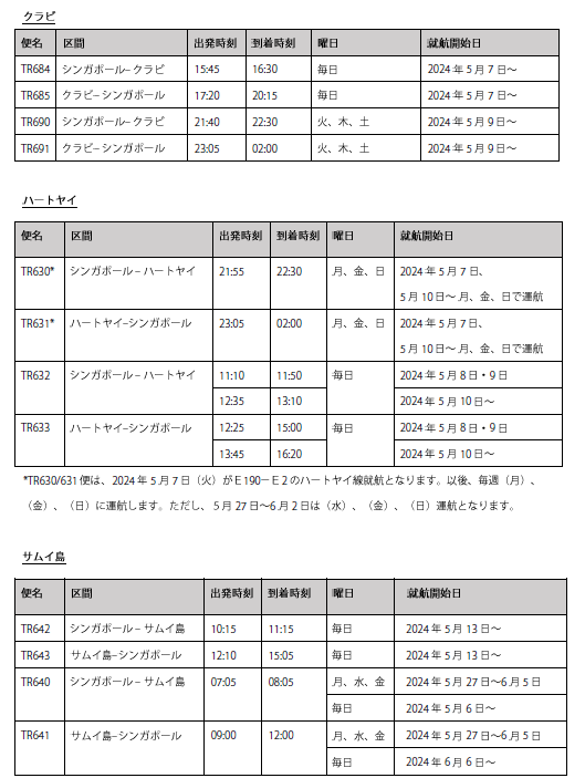 2024年5月7日時点で、スクートはアジア太平洋、中東、ヨーロッパの15か国と地域の67の目的地に就航しています。エンブラエルE190-E2のフライトスケジュールの詳細については、下記を参照してください。チャンギ国際空港での就航イベントの画像はこちらでご覧いただけます。
