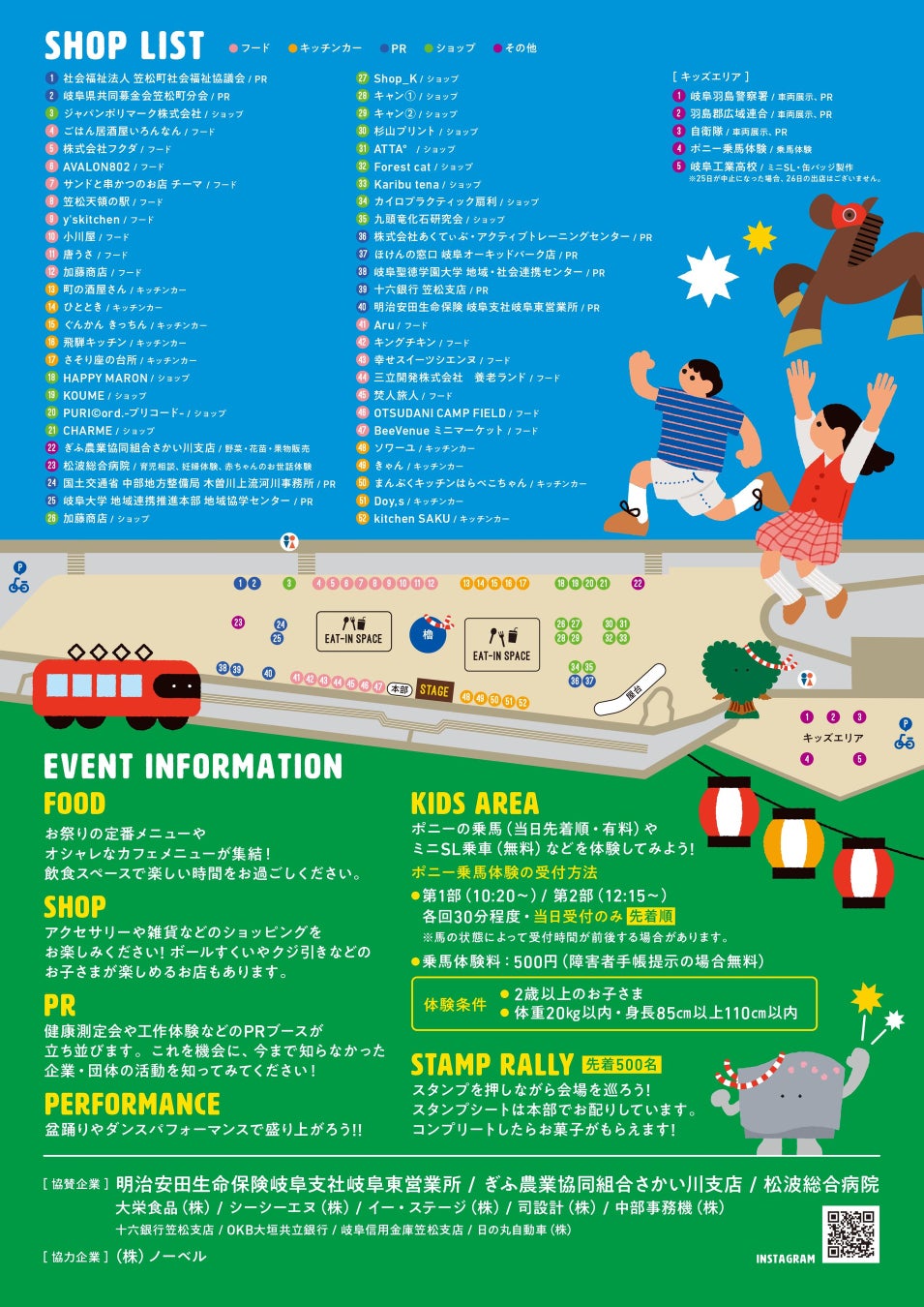 毎年恒例、笠松町の秋の風物詩ともいえるイベントで、会場では、お祭り定番メニューからおしゃれなカフェメニューまでが揃ったキッチンカーなどのグルメ店舗、アクセサリー・雑貨などを販売する店舗など約60店舗が出店予定。会場内にあるキッズエリアでは小さなお子様が楽しめる「ミニSL」や「ポニーの乗馬」を体験できるほか、警察・消防・自衛隊の車両も展示予定。