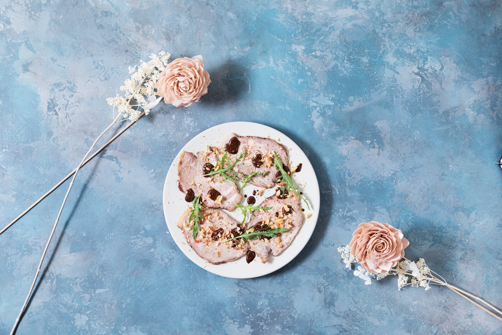 しっとり焼き上げたローストポークをモネの代表作〈睡蓮〉の池に見立てて盛り付けました。少し苦みが効いたカカオのソースでお召し上がりください。