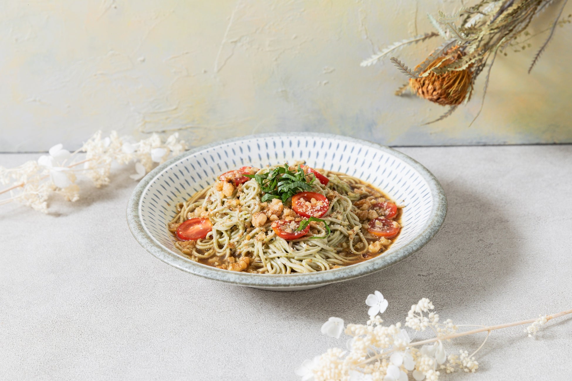 バジルの香りとへぎ蕎麦独特の食感に浸ることのできる蕎麦です。