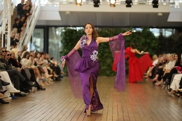 日本人デザイナーMAMI OKANOが一般女性をプロデュースして、舞台に挑む日本人モデルたちのウォーキングが、国際的なファッションイベントの一場面として登場している。