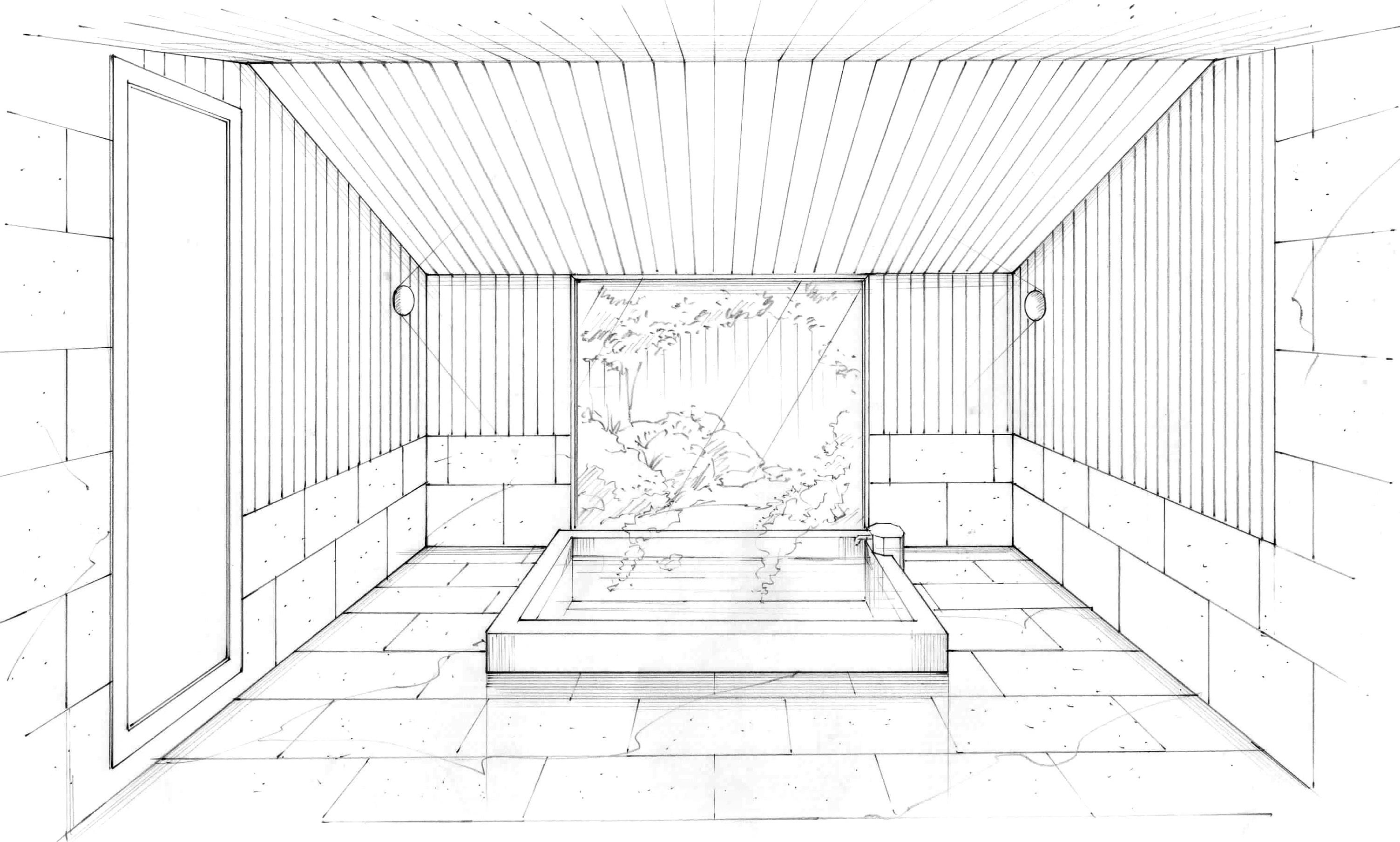 ・坪庭を眺める最も適した場所へ、浴槽位置を変更。また半露天としても楽しんでいただけるよう窓開口部分の改装を行います。
