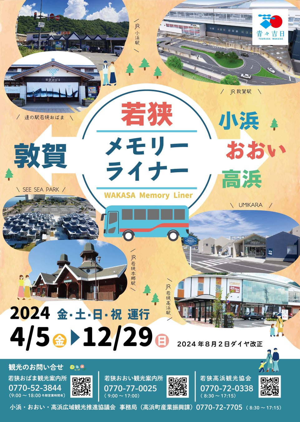 小浜市、おおい町、高浜町の3つの市町と各観光協会で構成する「小浜・おおい・高浜広域観光推進協議会」は、北陸新幹線福井・敦賀開業を契機に、JR敦賀駅と若狭西部の各地を結ぶ直通バス「若狭メモリーライナー」を実証運行しております。この度、「若狭メモリーライナー」の利便性を向上させるため、敦賀駅西口方面にバス停を追加し、ダイヤを改正することといたしました。