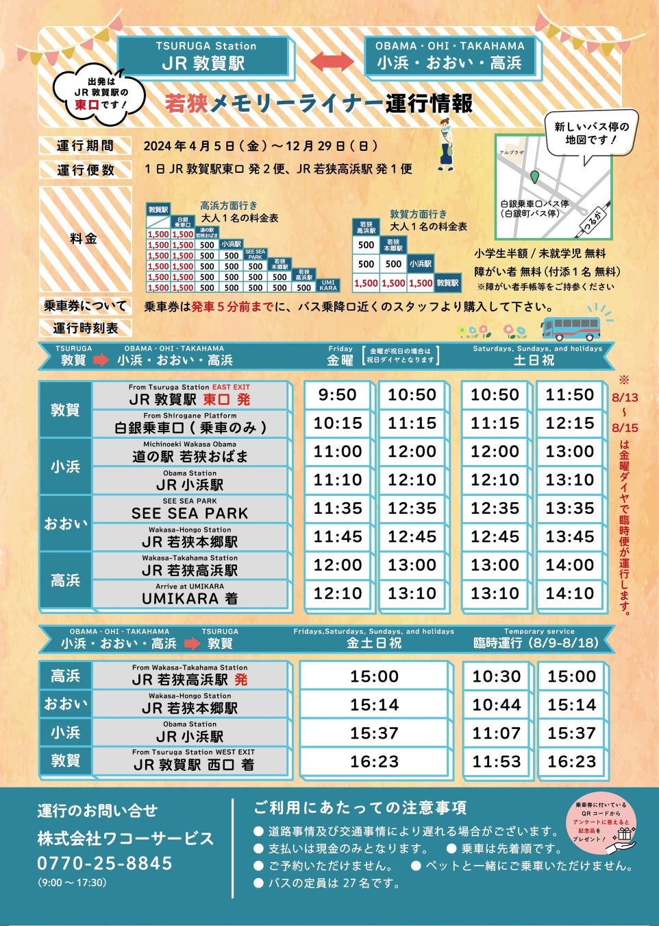 若狭観光がもっともっと便利に。北陸新幹線敦賀駅からの直通バス「若狭メモリーライナー」8月2日ダイヤ改正!&夏期臨時便運行!