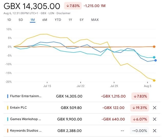 年 8 月のロンドン証券取引所のゲーミング関連主要 4 銘柄について、独自に市場動向と分析を行