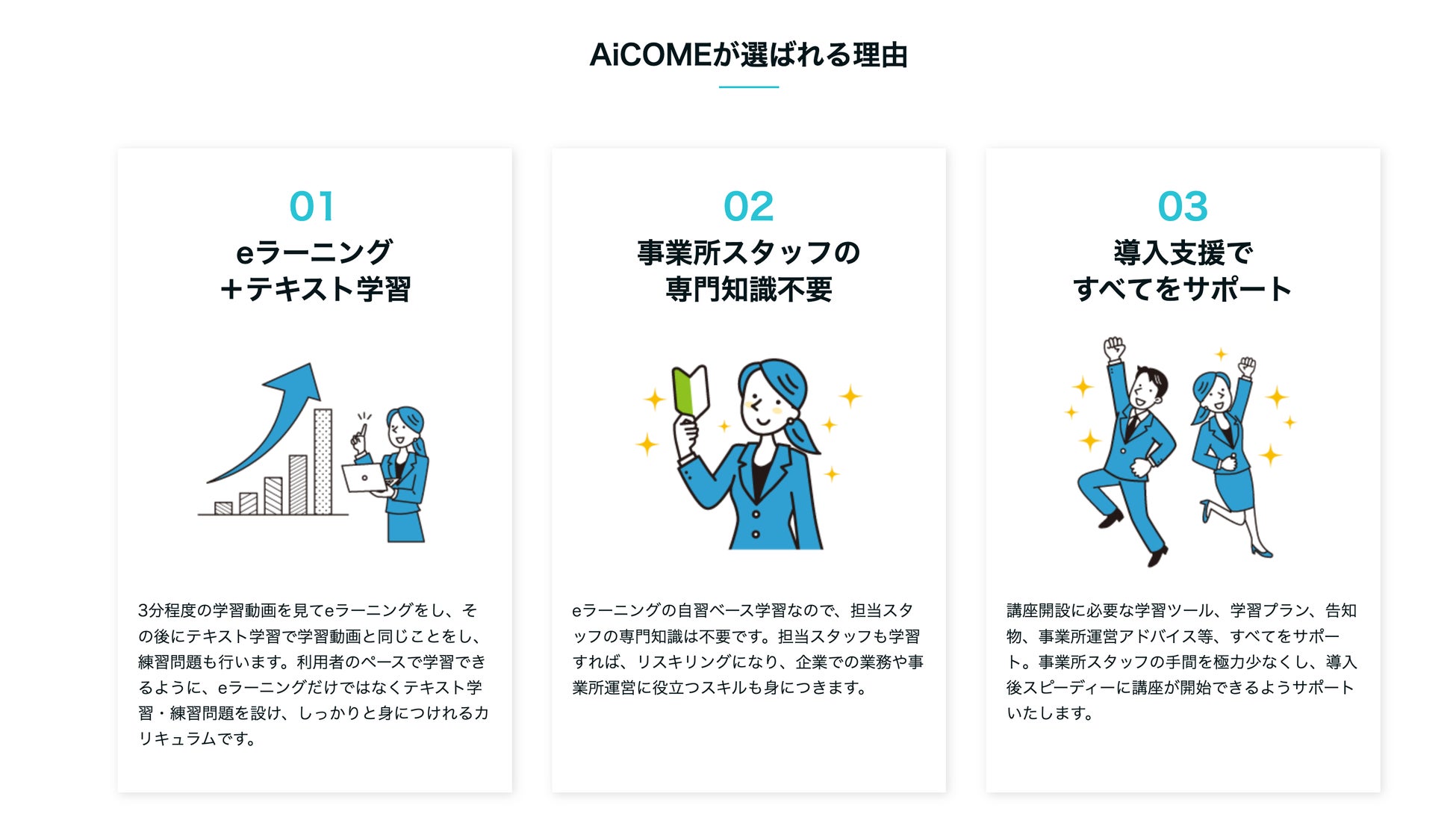 AiCOMEは、障がい福祉業界向けAIツール学習支援サービスです。特に、就労移行支援事業所で就労を目指している利用者にAIツール学習を提供し、障がい者プロンプトエンジニアとしてAI時代を活躍