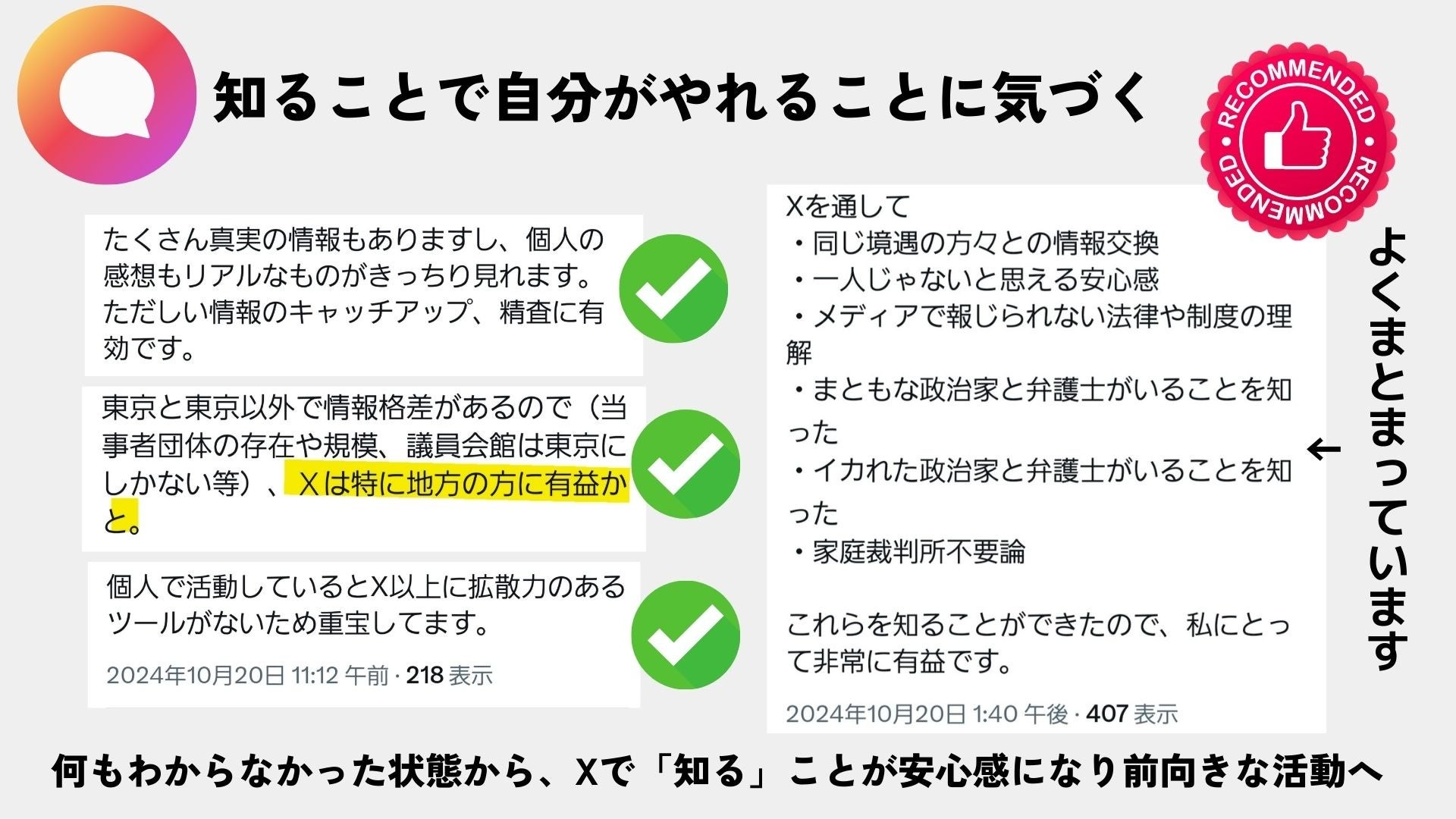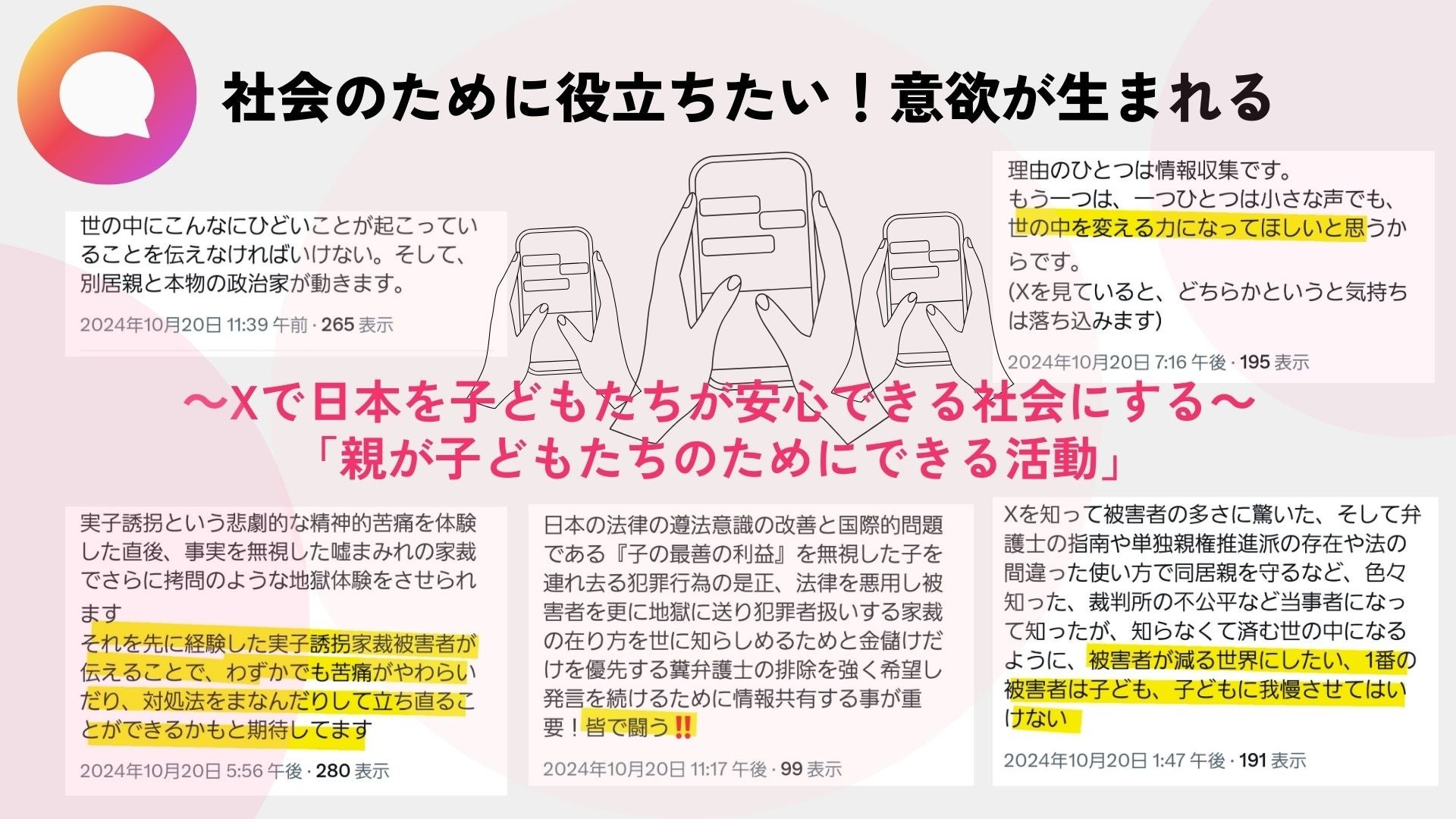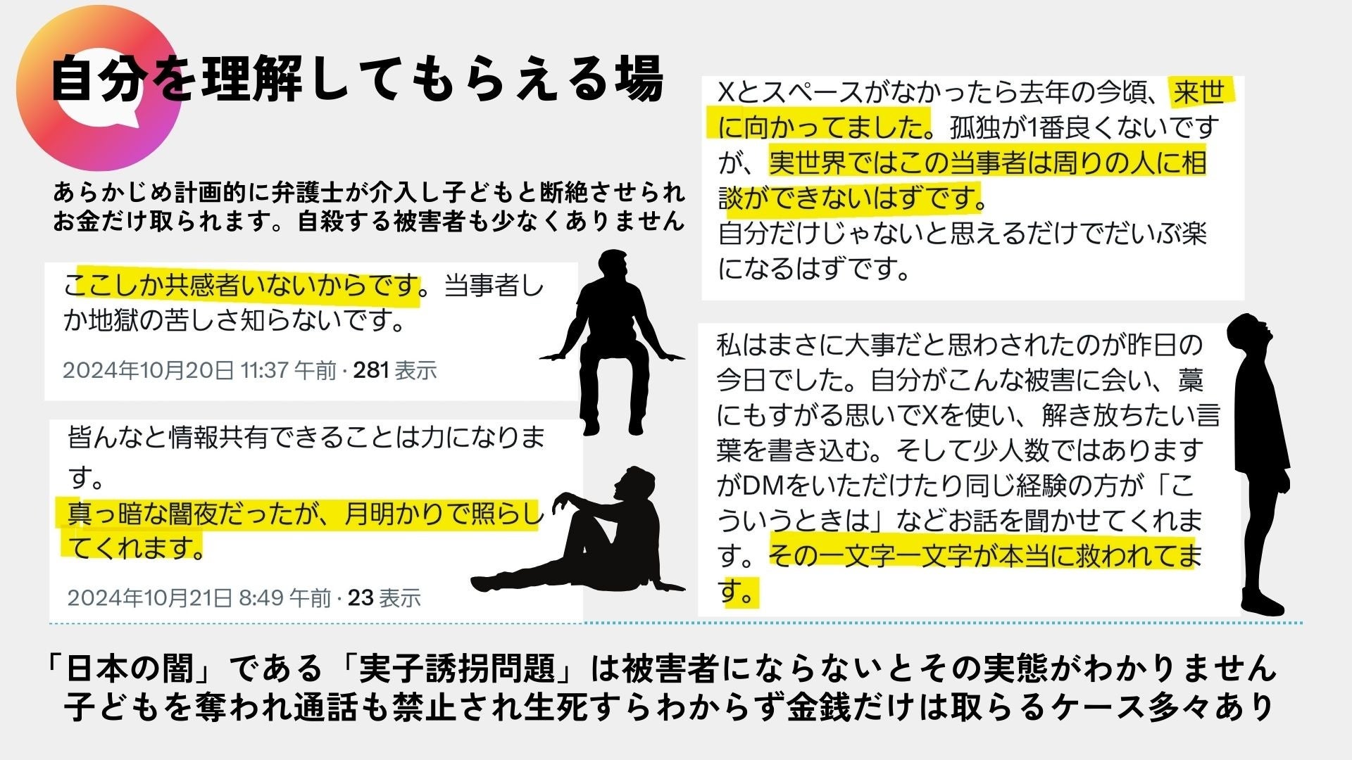 しかし、彼らは親として例え子どもたちに会えなかったとしても子どもたちの親として少しでも社会を変えようと日々声を上げている。子どもたちを想う切実な想いを原動力に「X」でこの問題についてを発言し、被害者たちは「子どもの親としての行動」をすることで彼らの明日へ生きる希望を自らが見出している。