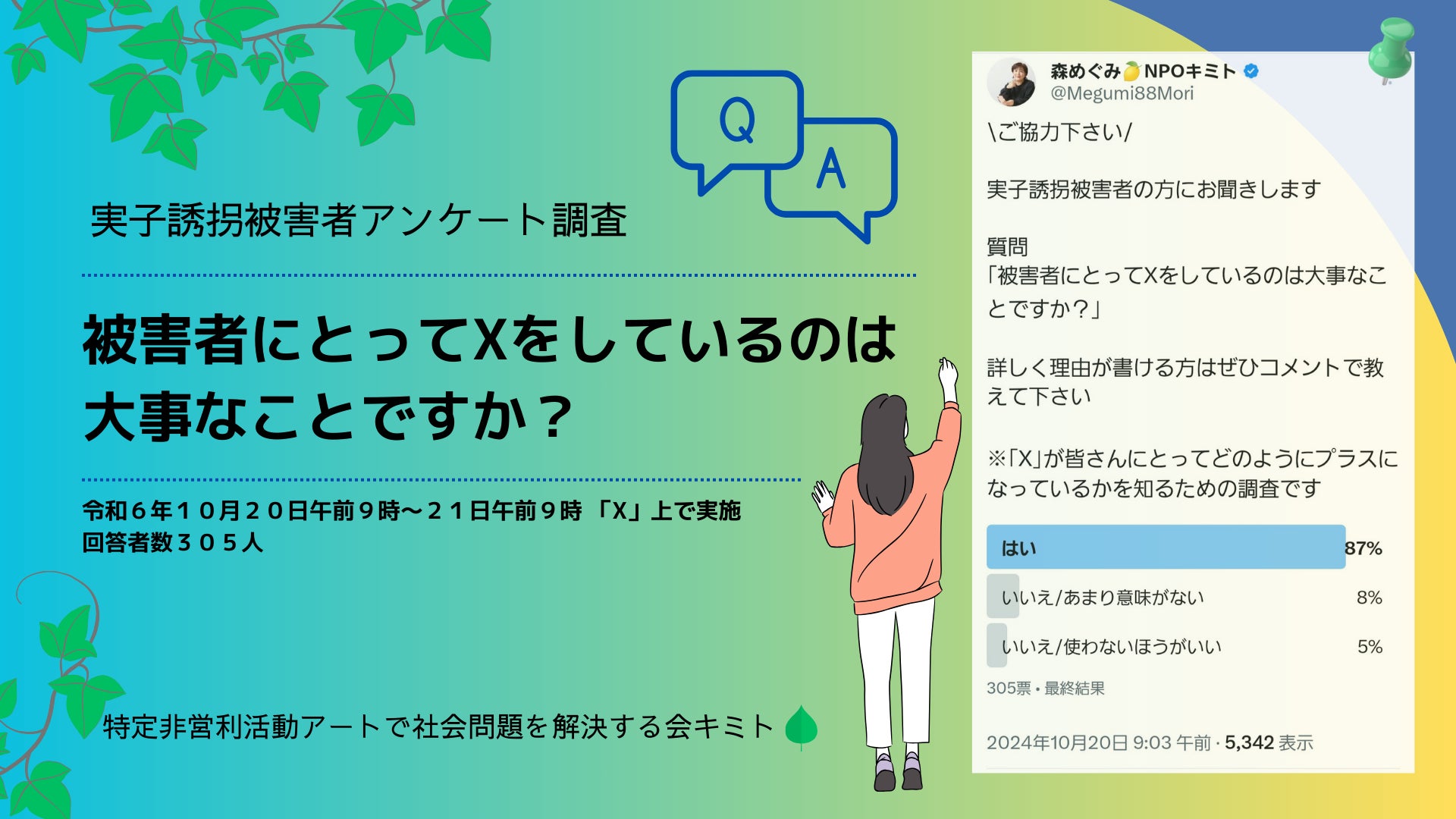 特定非営利活動アートで社会問題を解決する会キミト(東京都中央区銀座一丁目22-11銀座大竹ビジデンス2階/代表 森めぐみ)は、実子誘拐被害者(子ども連れ去り被害者)を対象に「被害者にとっての「X」の重要性」についてがわかるアンケート調査を実施しました。