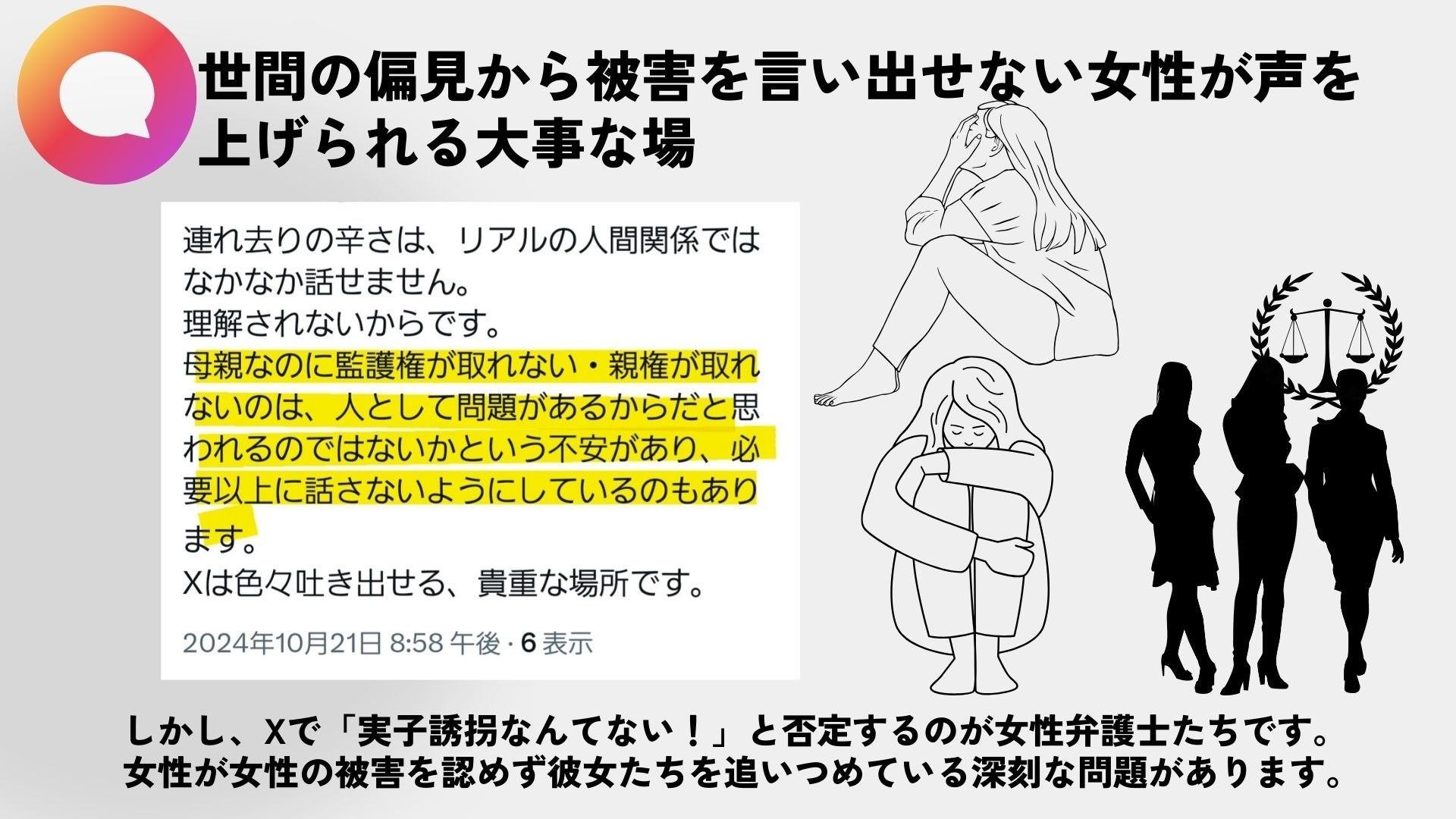 こうした女性弁護士が彼女たちが自分たちがすべての女性の代表かのように発言することで実子誘拐被害者女性が被害を打ち明けることができない状況にさせられている。弊会はこうした弁護士、多くは女性弁護士のあり方に問題意識を持ち引き続き調査を続けていく。