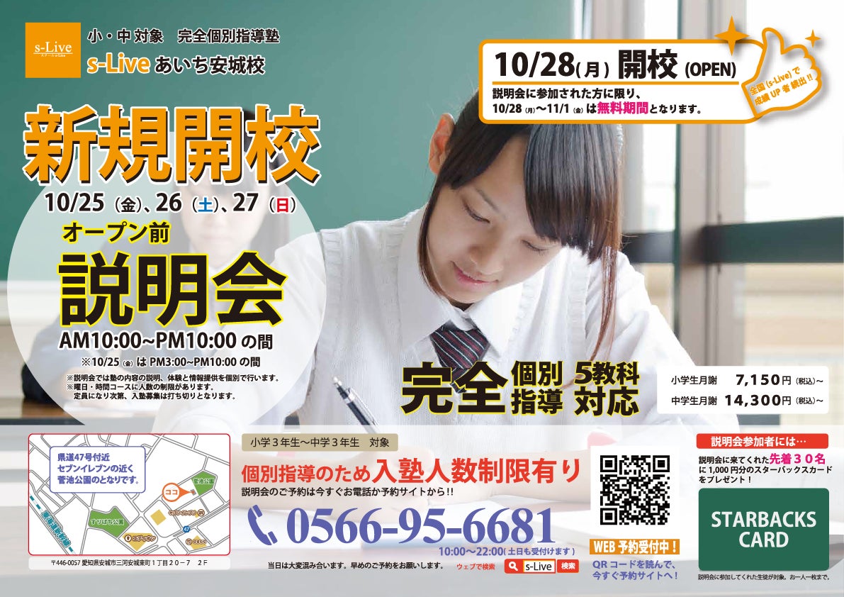 個別指導塾s-Liveは10月28日、愛知県安城市三河安城東町に新規校舎をオープン。10月25日~27日の3日間で開校前説明会を開催する。