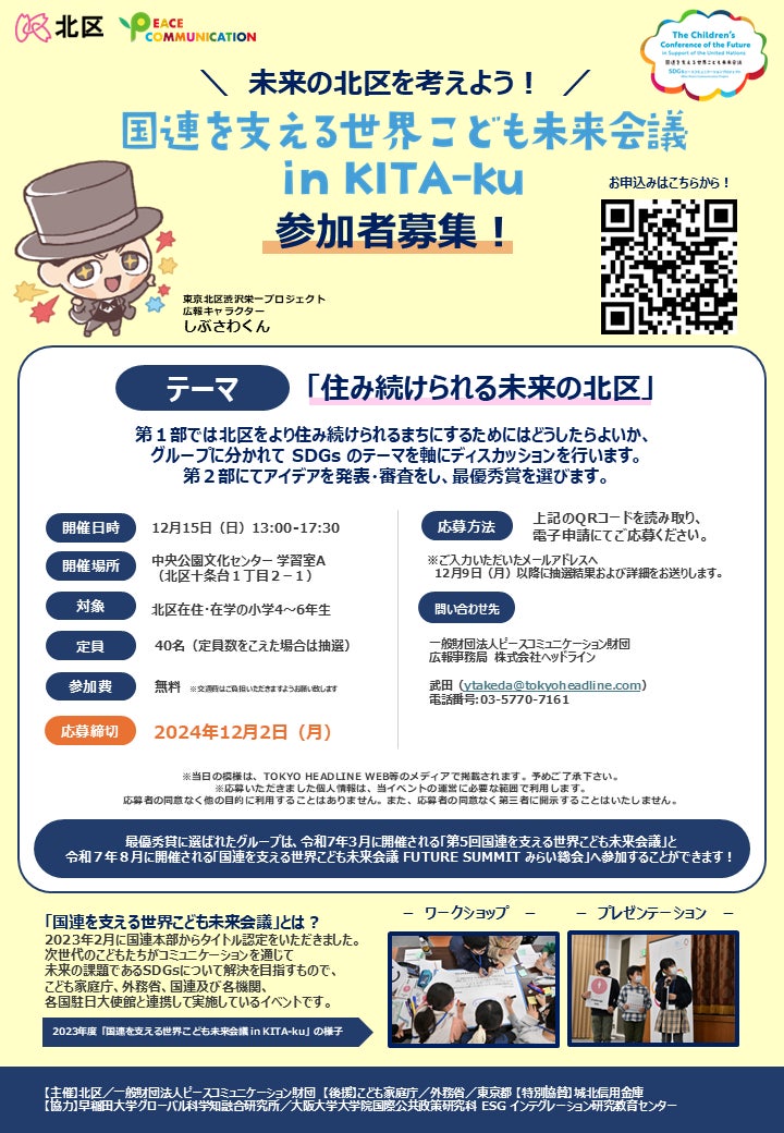 一般財団法人ピースコミュニケーション財団は、東京都北区の小学校に通う4~6年生を対象にした「国連を支える世界こども未来会議 in KITA-ku」を中央公園文化センターにて開催します。