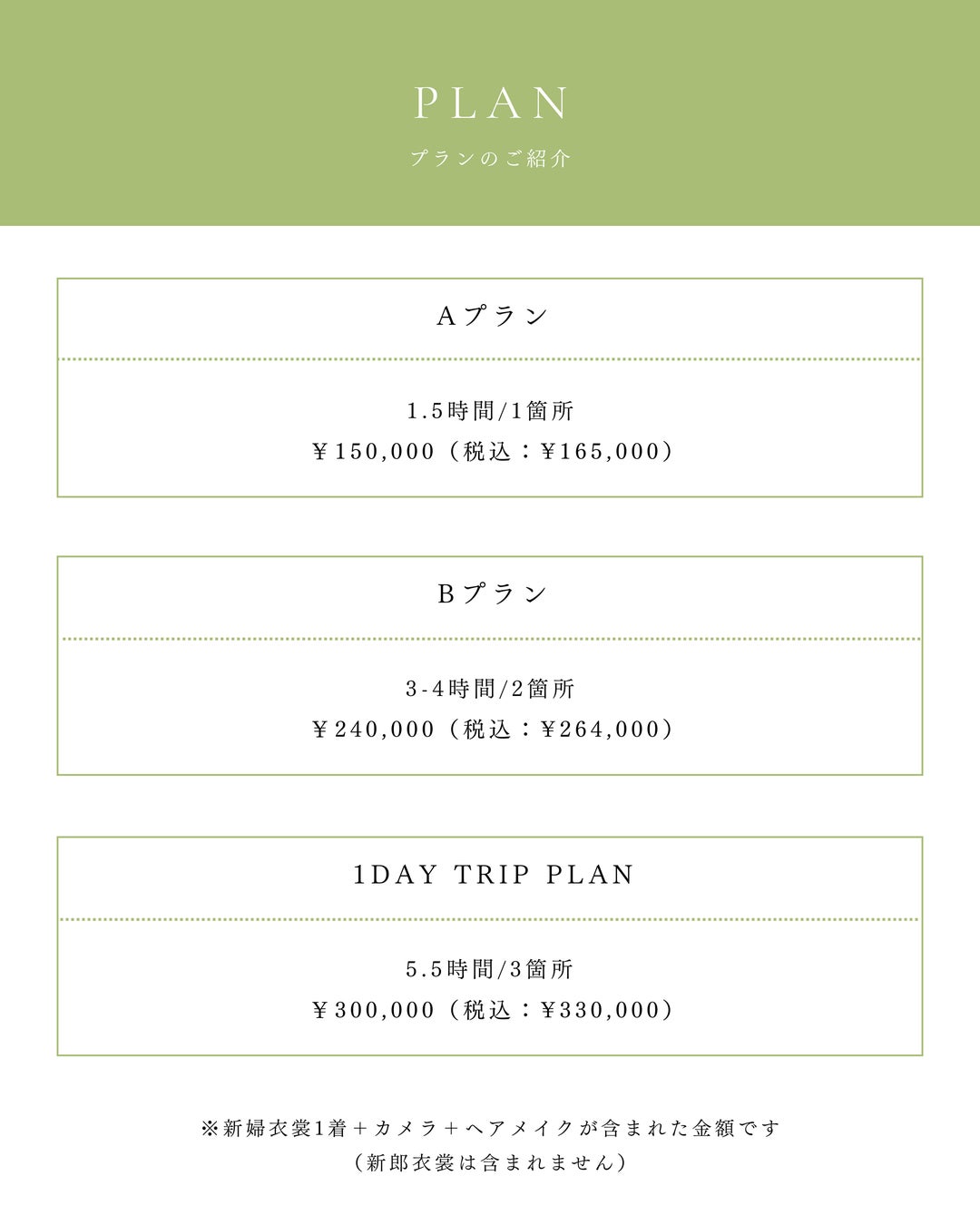 沖縄の自然とラグジュアリーを感じるロケーションで叶える、特別なフォトウェディングプランをご用意。撮影時間やロケーション数に応じて選べる3つのプランは、すべて「新婦衣裳・カメラマン・ヘアメイク」込みです。