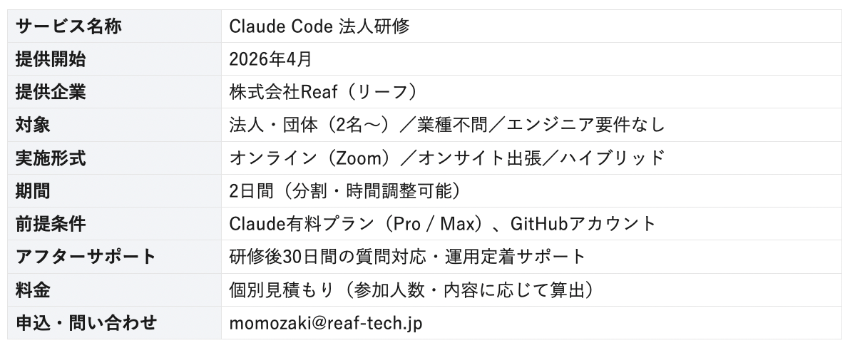システム開発・AI実装を手掛ける株式会社Reaf(本社:福岡県、代表取締役:桃崎、以下「Reaf」)は、2026年4月、法人向けの新サービス「Claude Code 法人研修」の提供を開始しました。