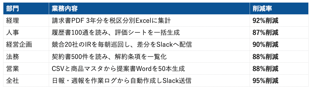 特に経理部門の請求書集計業務では、月間8時間を要していた作業が36分に短縮され、92%の工数削減を実現しました。