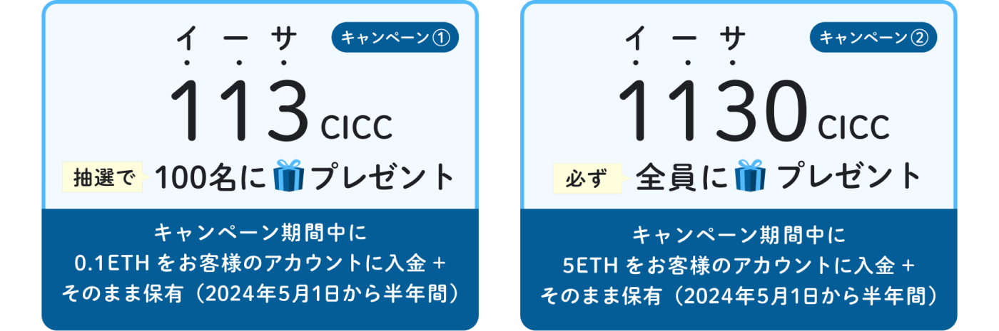 これを記念して、キャンペーン期間中にイーサリアム(ETH)を入金 + そのまま保有(2024年5月1日から半年間)していただいたお客様を対象に、カイカコイン(CICC)プレゼントキャンペーンを開催いたします。
