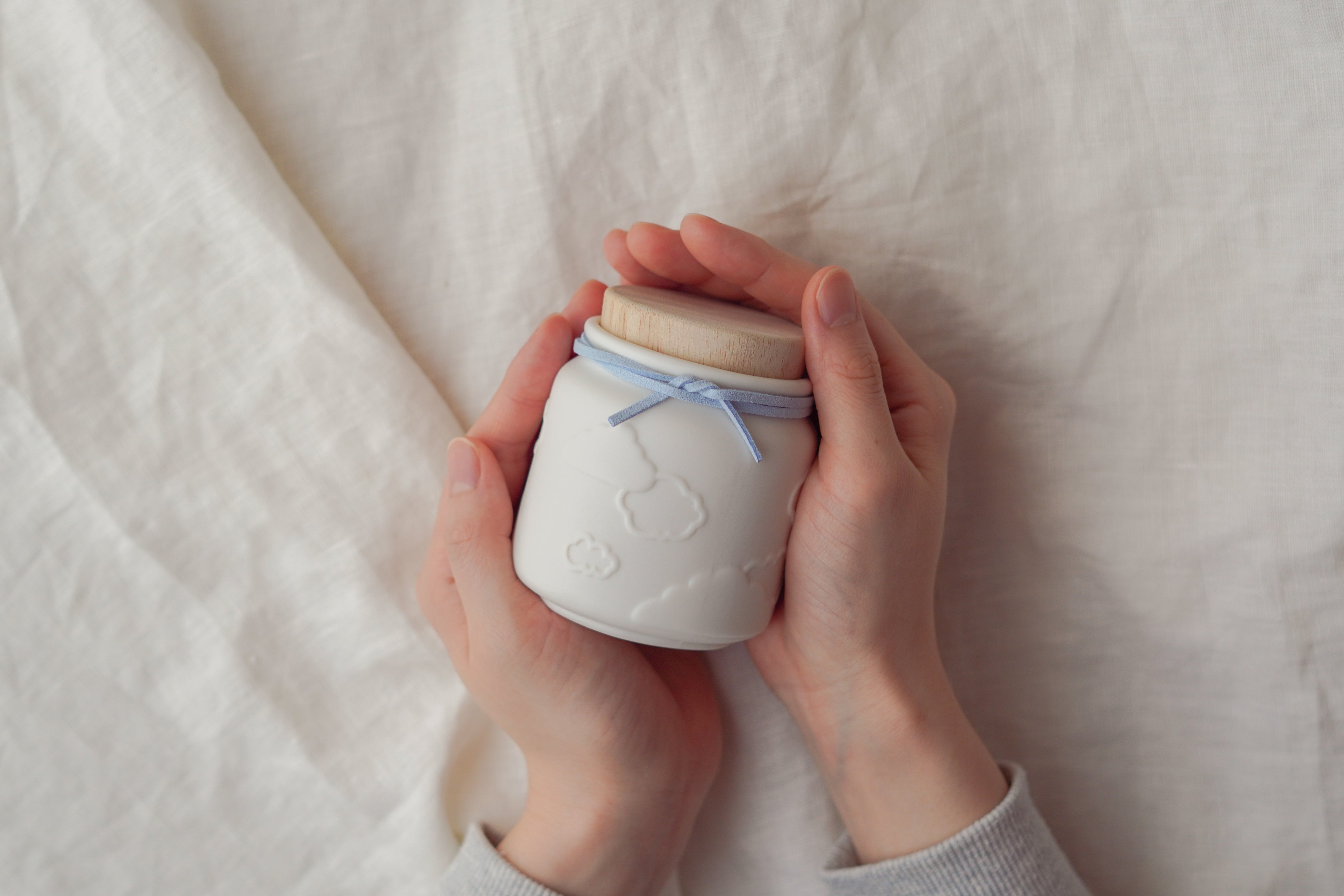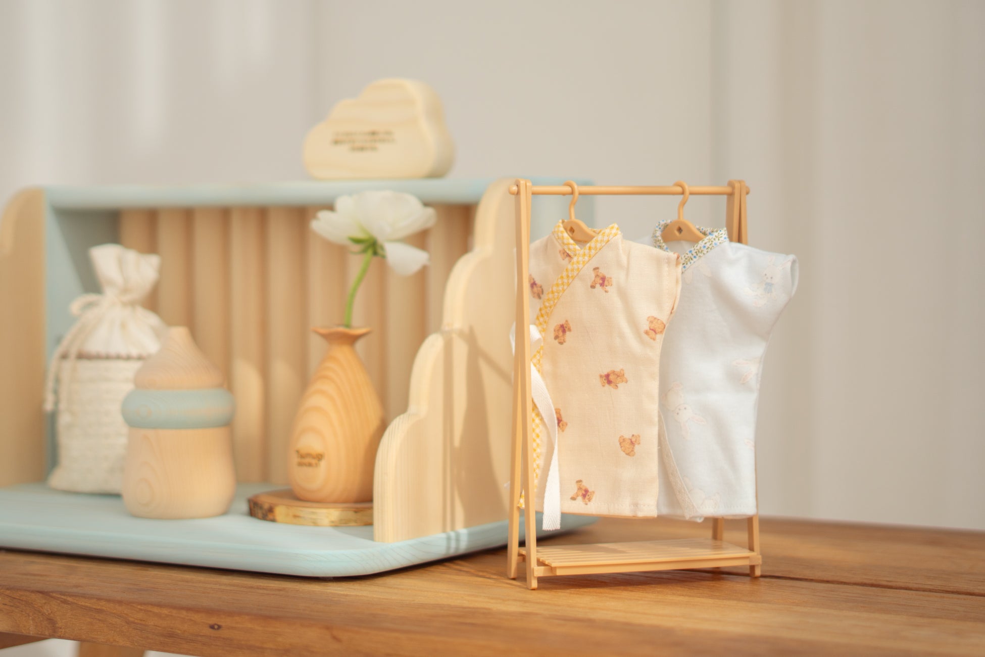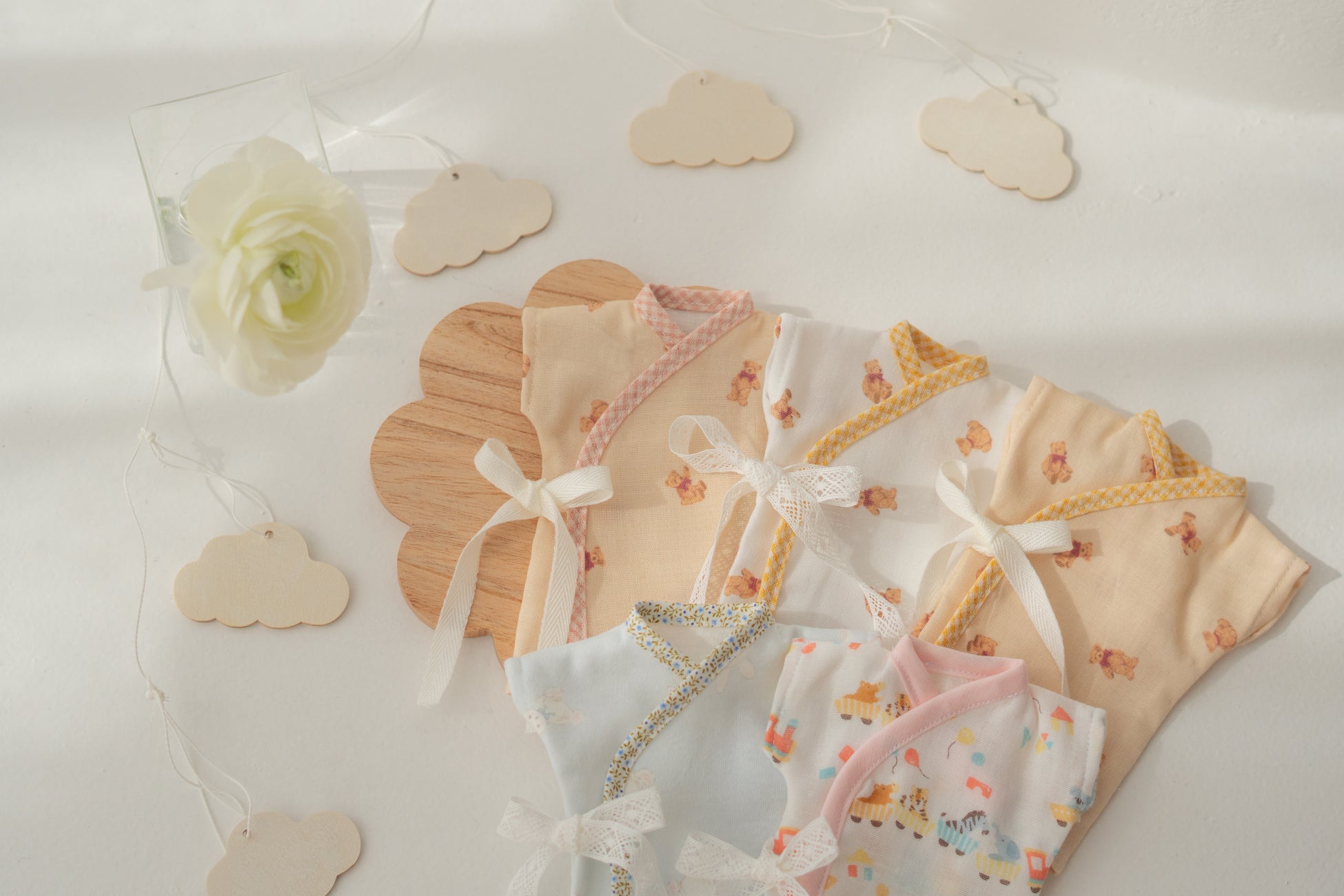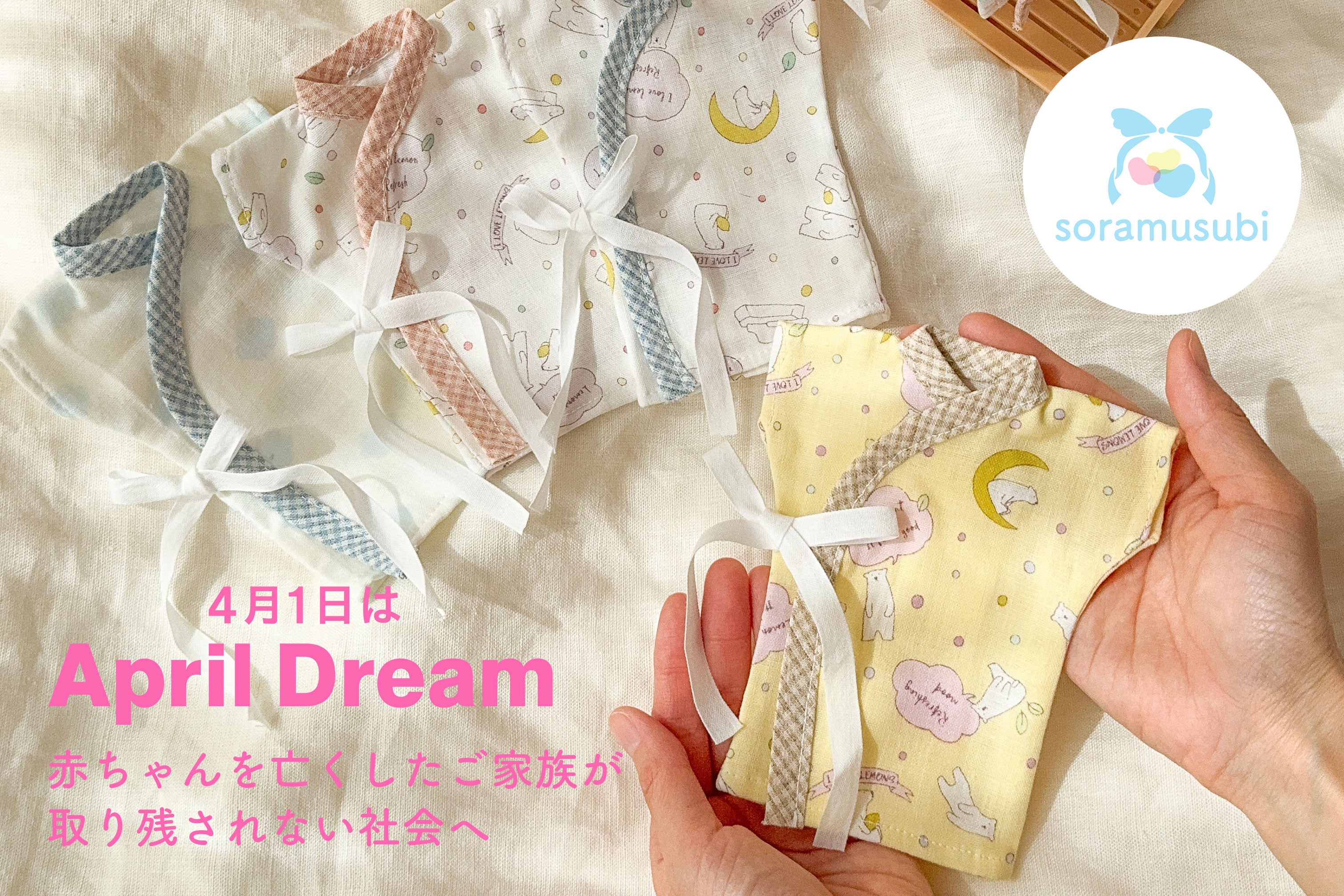 soramusubiは、お空へ旅立った赤ちゃんへのメモリアル品を手作りするとともに、お別れのときに着せてあげられる「小さな産着」を、必要としているご家族や医療機関へ寄付しています。