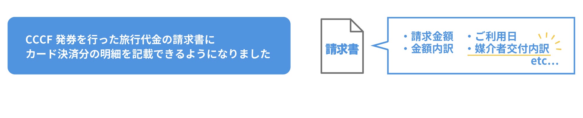 これまで旅行会社が顧客のクレジットカードでCCCF発券を行う際、請求書にカード決済分の明細を記載することができませんでした。インボイス制度の開始に伴い、多くのお客様から「カード決済分の明細を請求書に記載したい」とご要望いただき、この度のアップデートで対応しました。これにより、煩雑なCCCF発券分の請求処理が効率化されます。