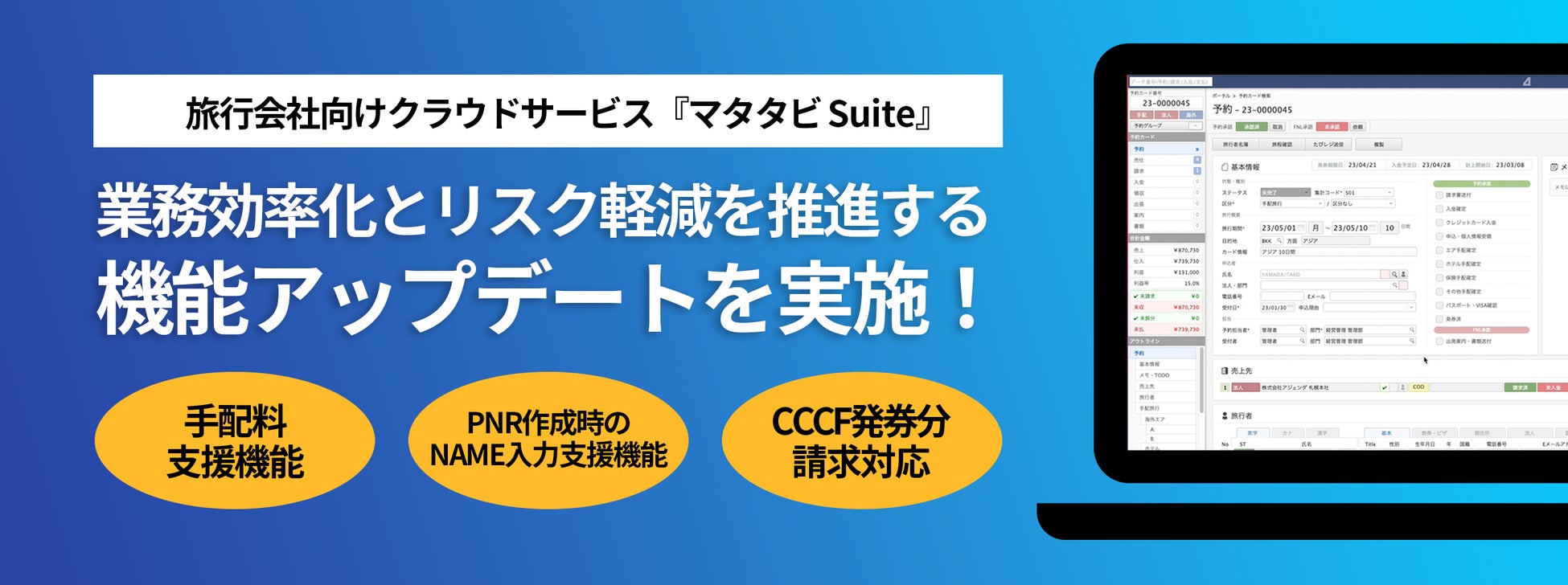 株式会社アジェンダ(本社:北海道札幌市、代表取締役社長:伊藤 智裕)は、旅行会社向けクラウドサービス『マタタビ Suite』の新機能追加およびシステム改善を目的としたアップデートを、2024年9月25日(水)に実施いたしました。本アップデートによって、旅行会社の業務効率がさらに向上します。