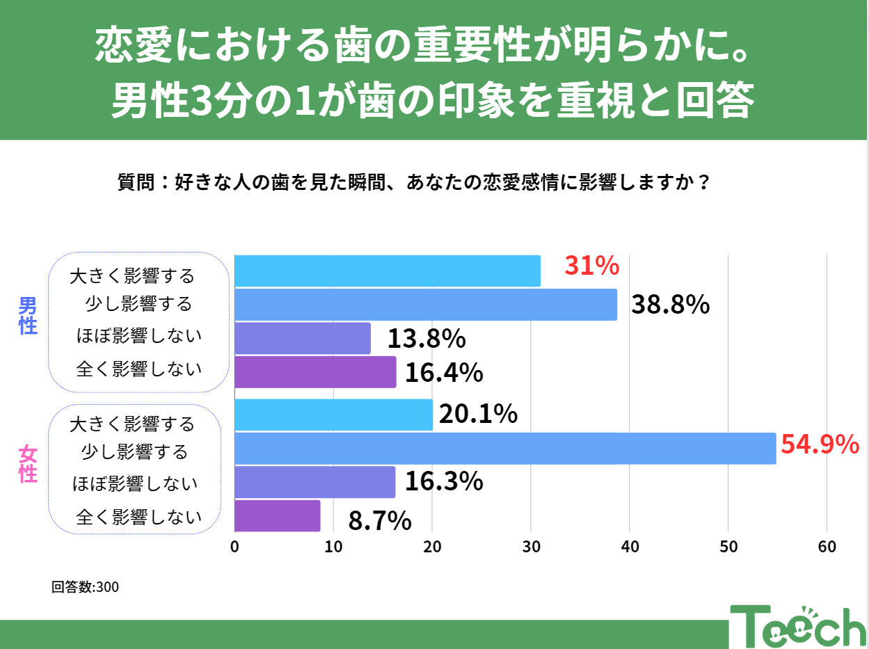 アンケートの結果、男性の約3人に1人、具体的には31%が、恋愛感情において歯の状態を重要視していることが明らかになりました。