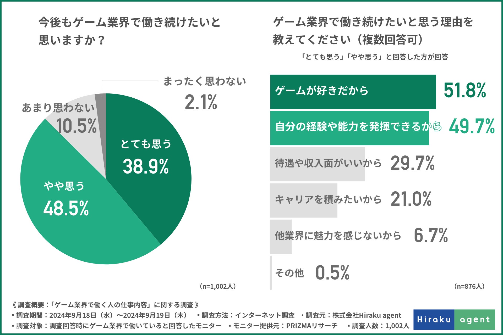 最後に、「ゲーム業界で働き続けたいと思う理由を教えてください(複数回答可)」と質問したところ、『ゲームが好きだから(51.8%)』と回答した方が最も多く、次いで『自分の経験や能力を発揮できるから(49.7%)』となりました。
