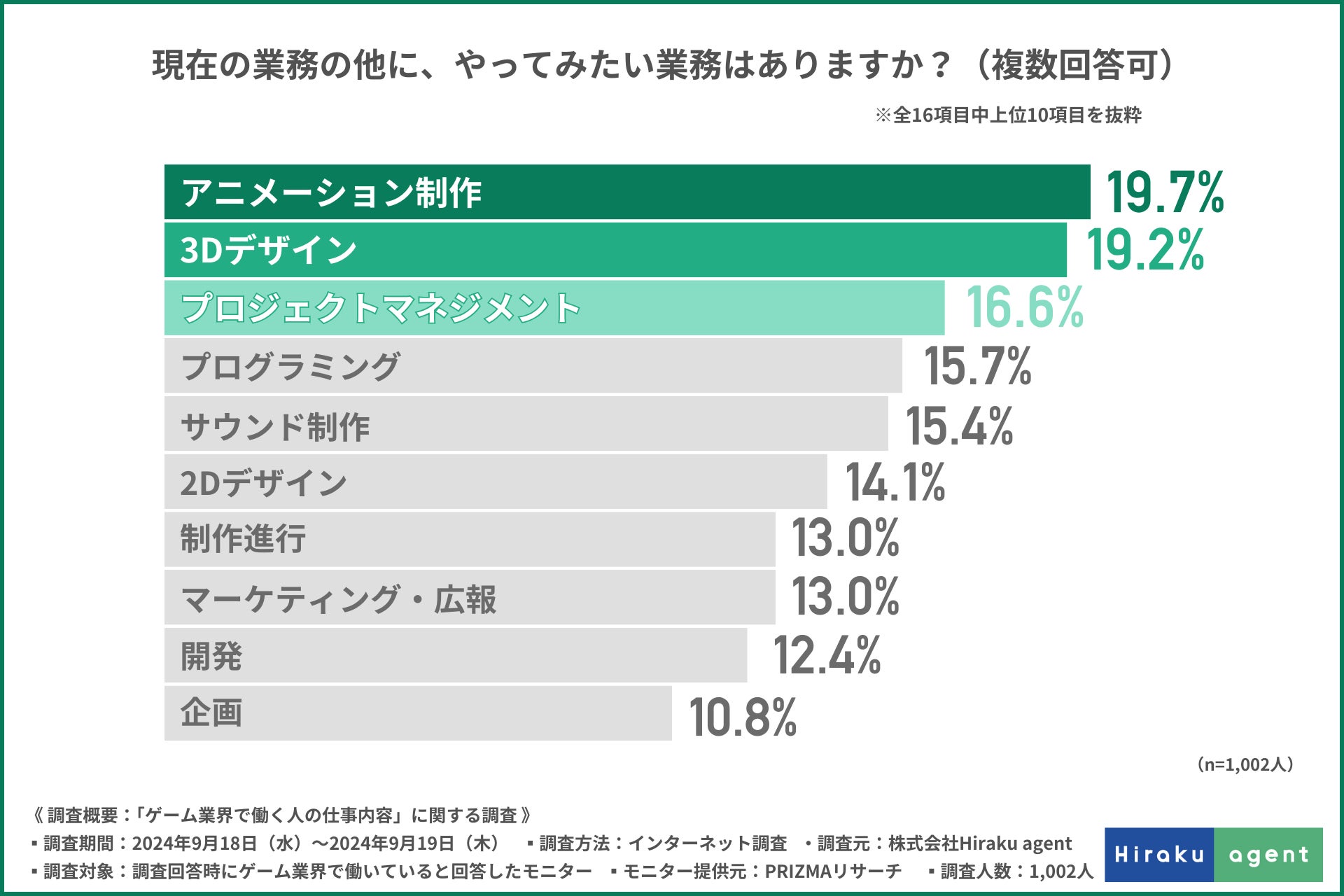 「現在の業務の他に、やってみたい業務はありますか?(複数回答可)」と質問したところ、『アニメーション制作(19.7%)』と回答した方が最も多く、次いで『3Dデザイン(19.2%)』『プロジェクトマネジメント(16.6%)』となりました。