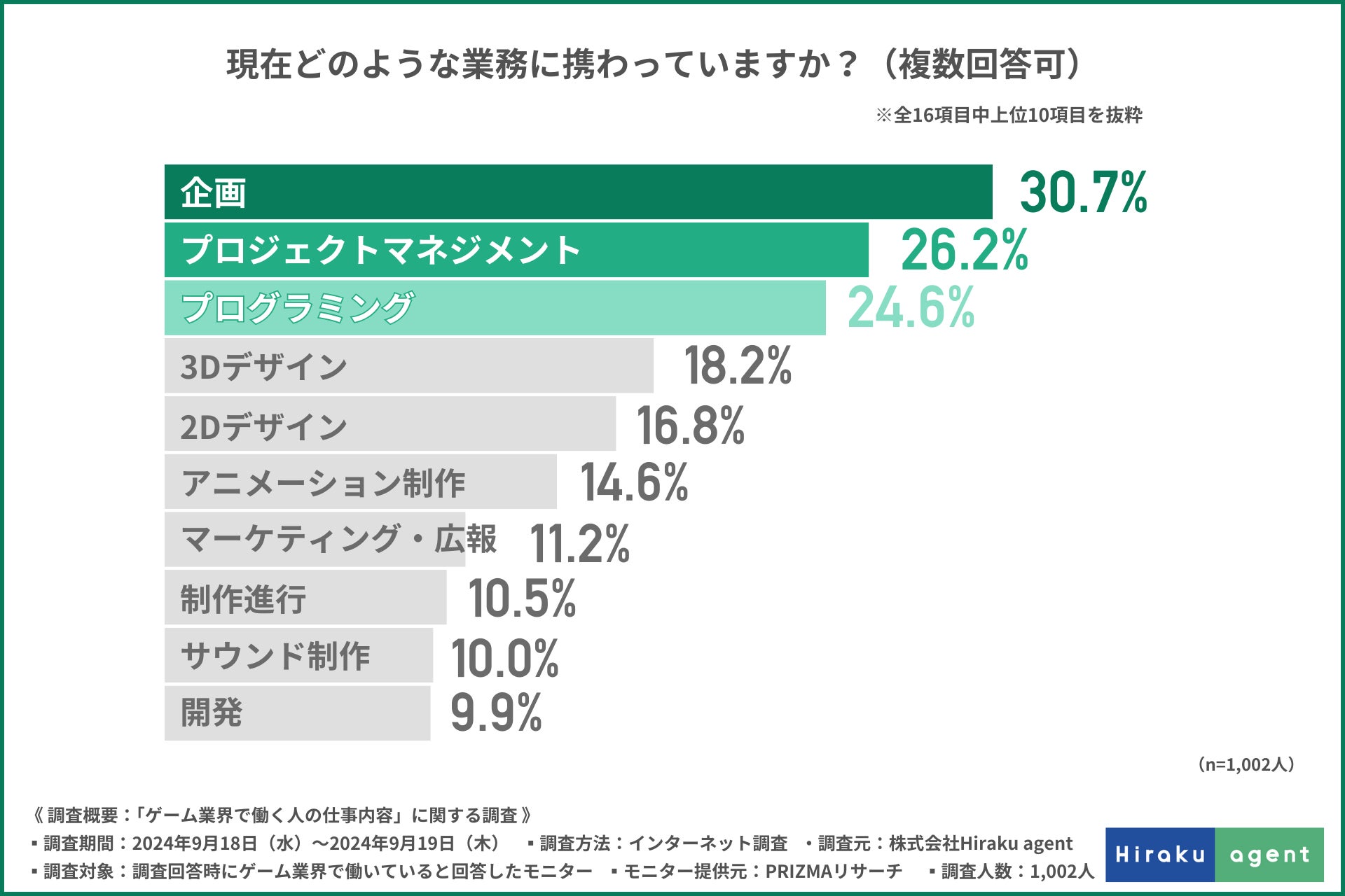 ゲーム業界は業務の内容が幅広いですが、企画やプロジェクトマネジメントがそれぞれ約3割、技術系ではプログラミングに携わっている方が約2割となりました。