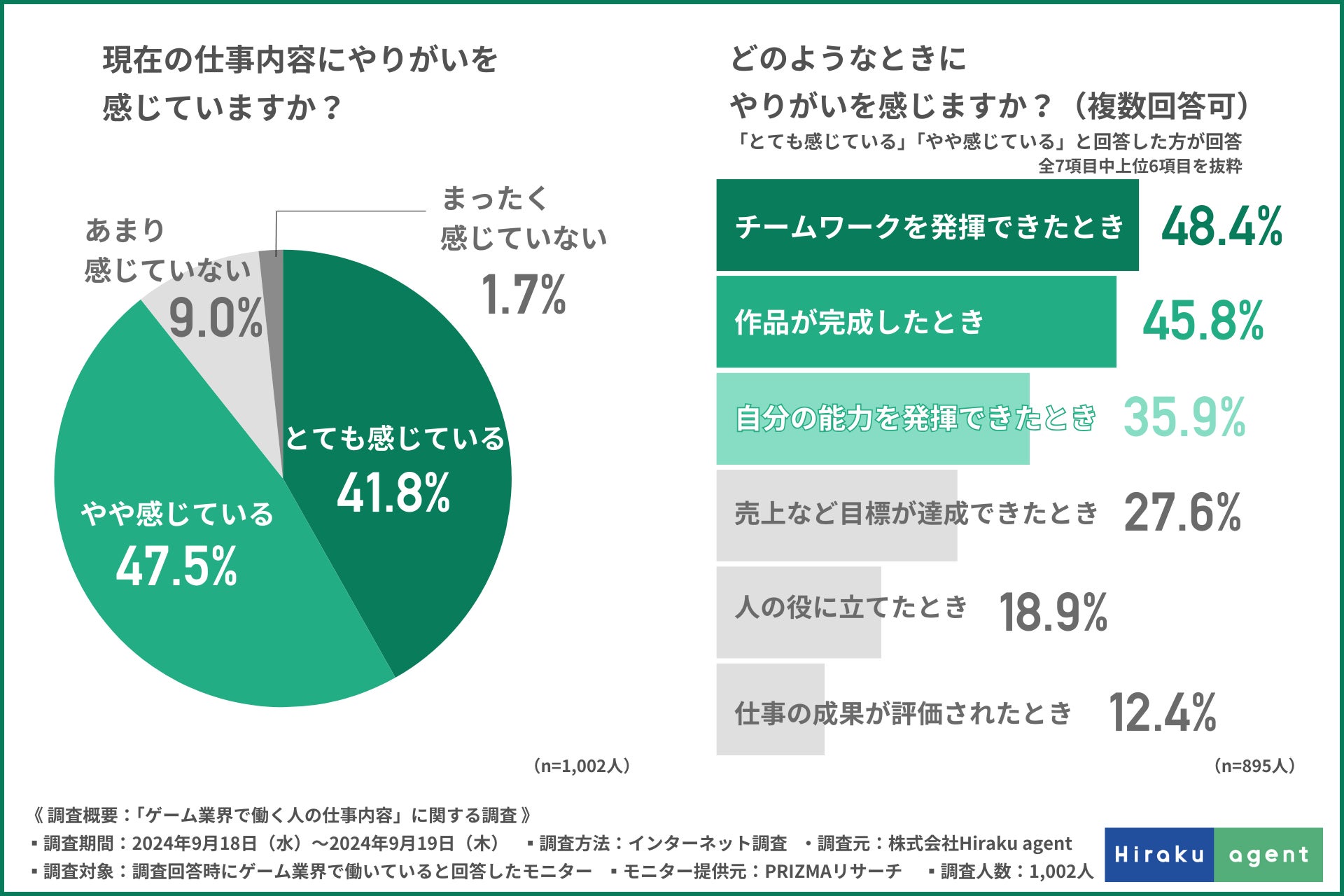 今年7月に行った調査(https://hiraku-agent.com/column/1194/)では、ゲーム業界で働く方の仕事に求めること第1位は「やりがい」という結果になりましたが、仕事にやりがいを感じている方はどのくらいいるのでしょうか。